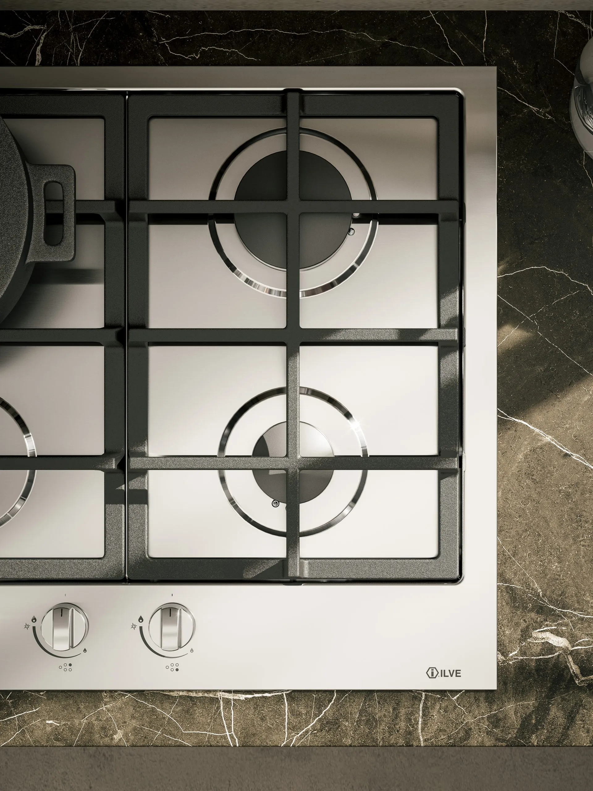 The built-in 5-burner gas hob in stainless steel with satin finish is constructed from a single sheet with no sharp edges: safe, durable and easy to clean, it is ideal for a kitchen that is used every day. The high efficiency burners, with a double row of holes and tilted flame, guarantee calibrated and even heat distribution. From an aesthetic point of view, the slim profile makes for an elegant and discreet top.