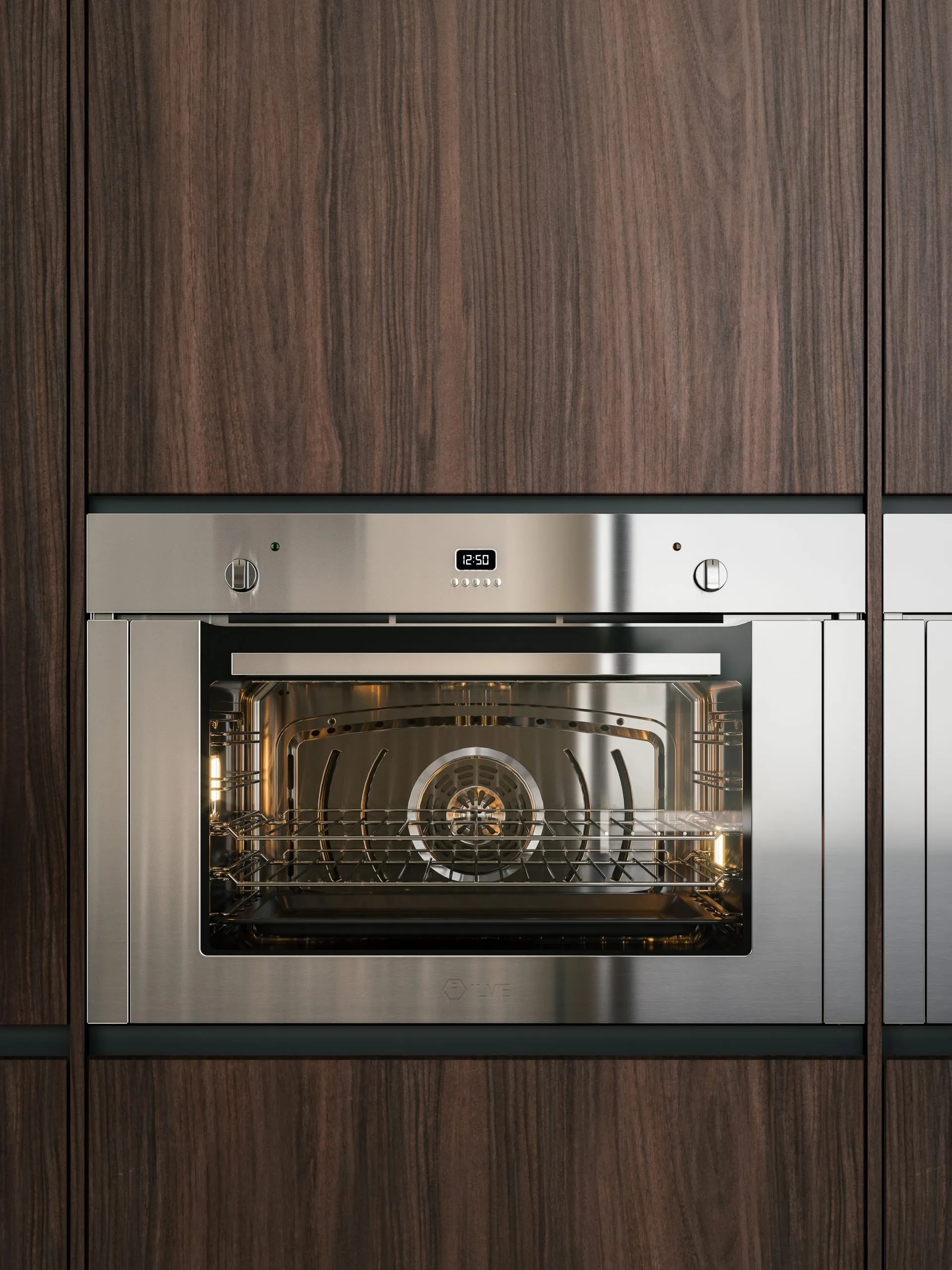 The built-in electric oven, also 90cm wide, has 9 functions with timed start-up and shutdown and simple, immediate programming via display and control panel: with a temperature range from 30°C to 300°C, it is suitable for any type of cooking.