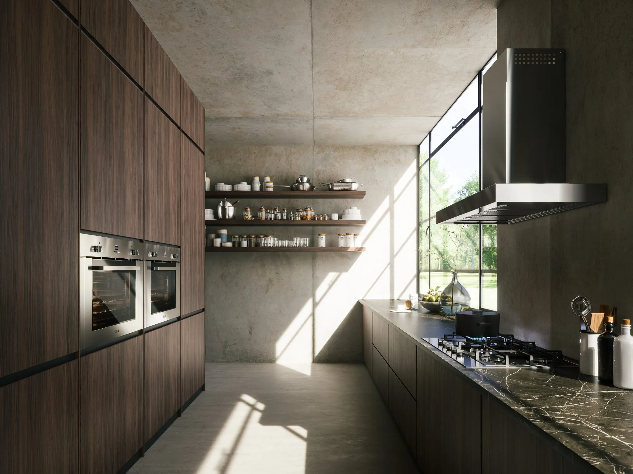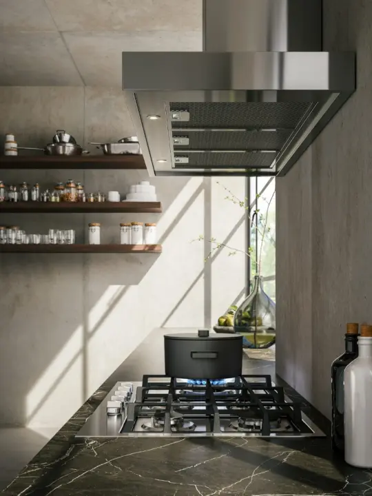 The 90 cm low-energy wall-mounted extractor hood complements the cooking area by quietly improving air quality.