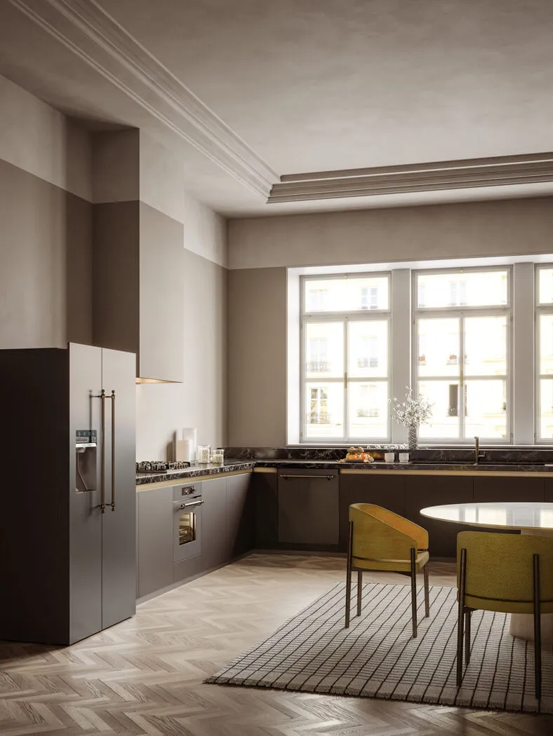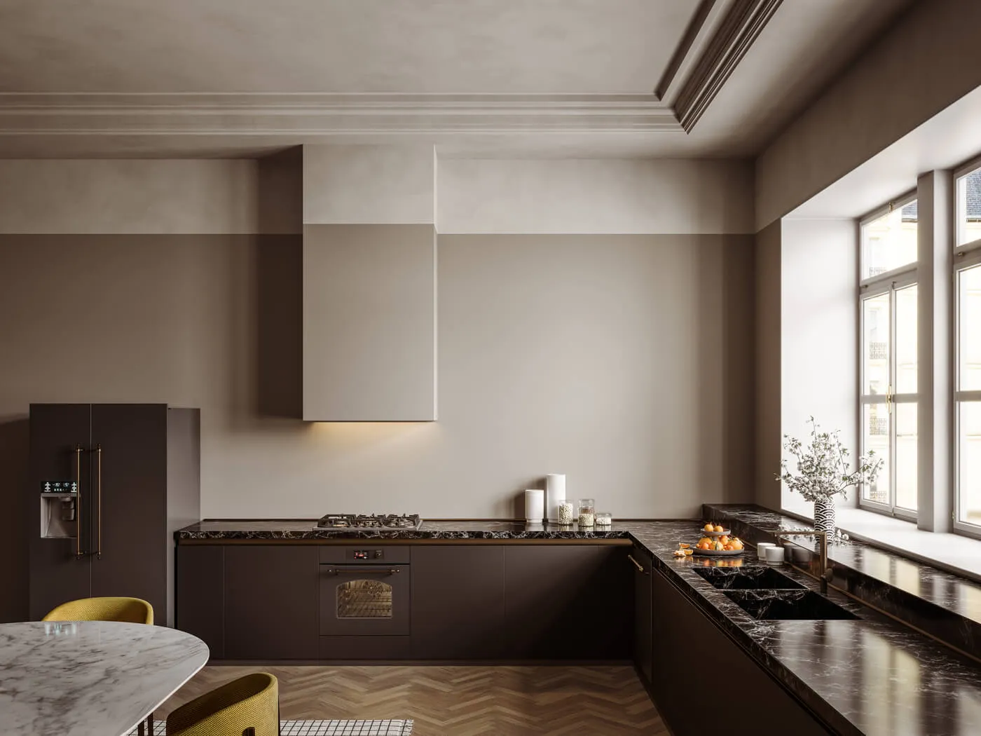 Vintage atmosphere for a kitchen that perfectly interacts with the past and the contemporary. Muted colours, dark tones and classic motifs, such as the herringbone of the parquet flooring, create an elegant, austere and sophisticated ambiance: the monumental hood seamlessly hugs the wall, offering a three-dimensional trompe l’oeil that is also echoed in the black veined marble worktop. The reference to Aires Mateus’ architecture is almost inevitable: absolute, soundless, minimalist, sculptural spatiality.