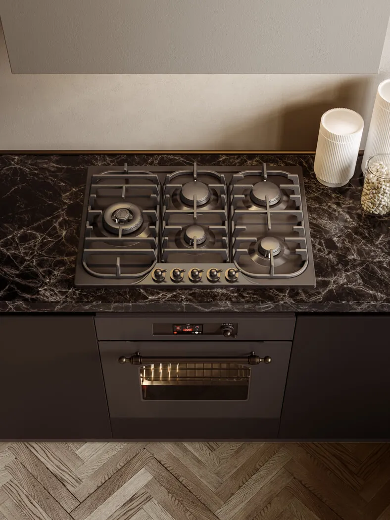 The 70 cm built-in hob from Ilve’s Nostalgie collection stands out naturally from the marble veins with its brass burners protected by a special nanotechnological treatment and with the characteristic knobs that reprise the shapes of old-fashioned range cookers. The interplay between past and present continues thanks to these retro aesthetic cues combined with state-of-the-art technology: even the 60 cm oven echoes the nostalgic character of the collection in the colours and finishes for knobs and handles, while guaranteeing high performance thanks to the 4.3 cm TFT screen and electronic temperature control up to 320° C.