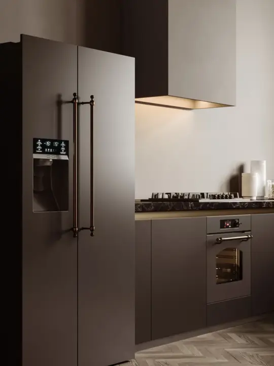 The Graphite Mat side by side refrigerator with burnished finish, imposing and minimalist, closes the perimeter mirroring the hood and echoing the unmistakable style of the Ilve collection.