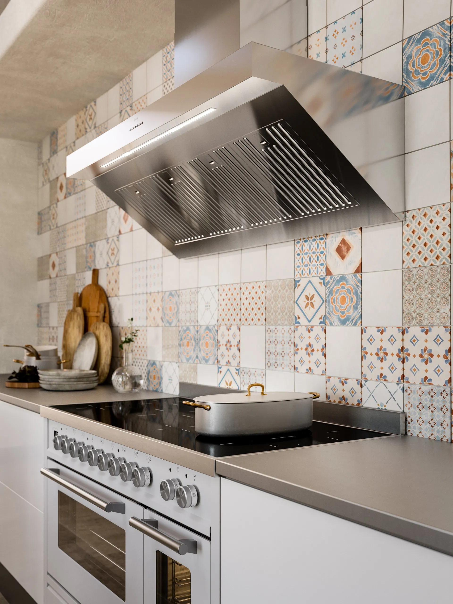 The 120 cm range cooker with flush-mounted induction hob and 7 cooking zones is white with satin finish to blend in perfectly with the style and furniture, while the 120 cm wall-mounted extractor hood with stainless steel baffle filters creates a professional atmosphere that does not alter the sense of intimacy one can feel within the walls of this charming masseria.