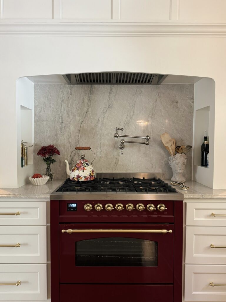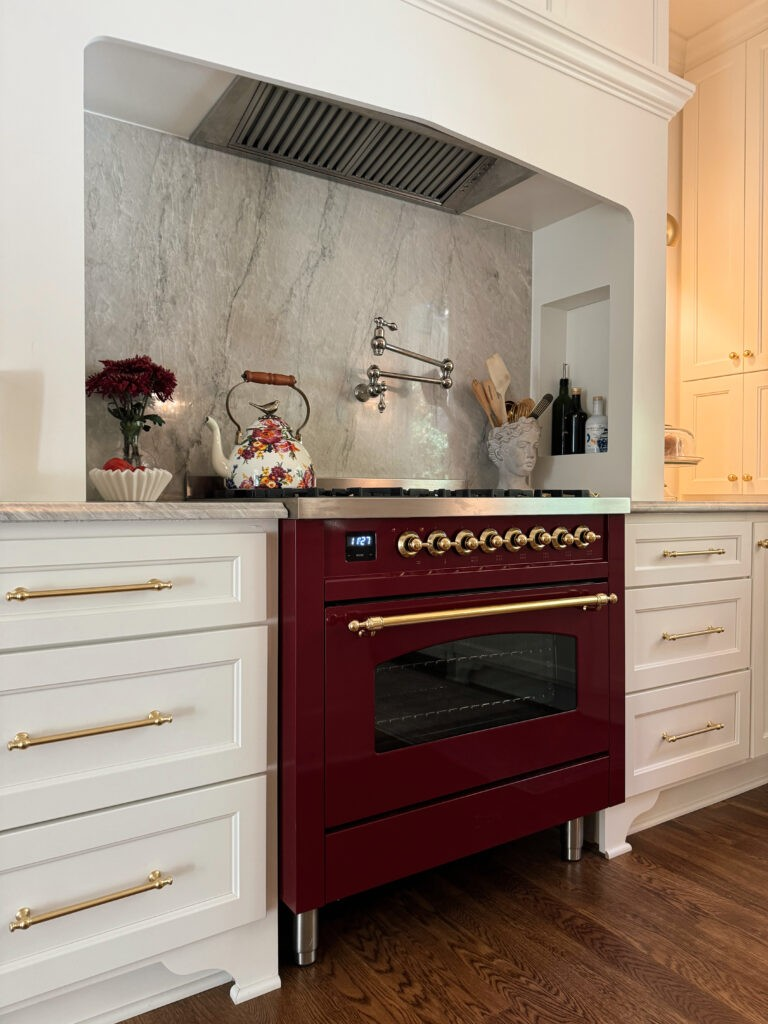 From a practical standpoint, the Ilve Nostalgie 36″ range — the option we chose — boasts 6 sealed burners (3 double burners, 3 single burners), and a flat-top griddle you can place across the middle section of the stovetop. We’ve used the griddle several times already for smash burgers and breakfast, and it’s an awesome feature!