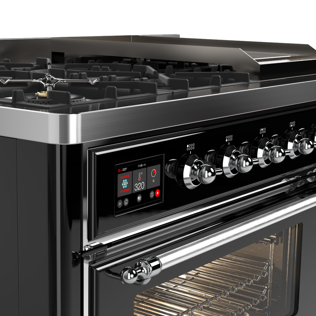 It is an ILVE dual fuel range from the Majestic II series with triple glass door, 9 gas burners and a griddle, equipped with a total black brass burner with nonstick nanotechnological coating.