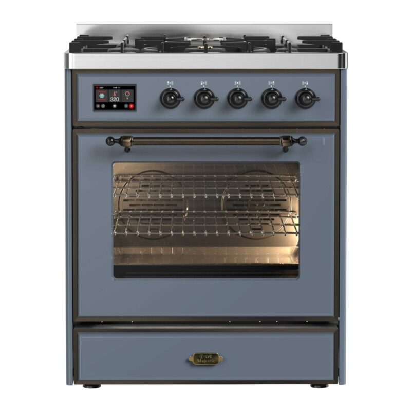 ILVE UM30DNE3BGBLP Majestic II 30 inch Dual Fuel Range with 5 Black Brass Burners (Liquid Propane, Triple Glass Door, Blue Grey, Burnished)