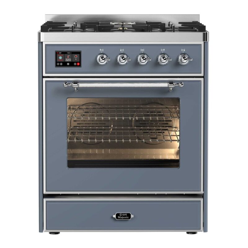 ILVE UM30DNE3BGCLP Majestic II 30 inch Dual Fuel Range with 5 Black Brass Burners (Liquid Propane, Triple Glass Door, Blue Grey, Chrome)