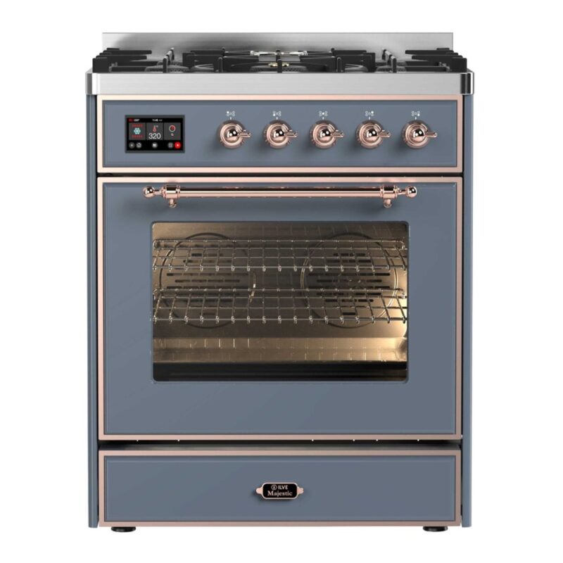 ILVE UM30DNE3BGP Majestic II 30 inch Dual Fuel Range with 5 Black Brass Burners (Natural Gas, Triple Glass Door, Blue Grey, Copper)
