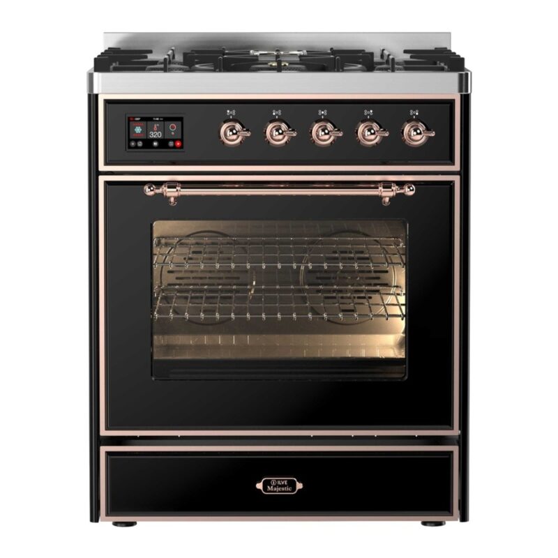 ILVE UM30DNE3BKP Majestic II 30 inch Dual Fuel Range with 5 Black Brass Burners (Natural Gas, Triple Glass Door, Glossy Black, Copper)
