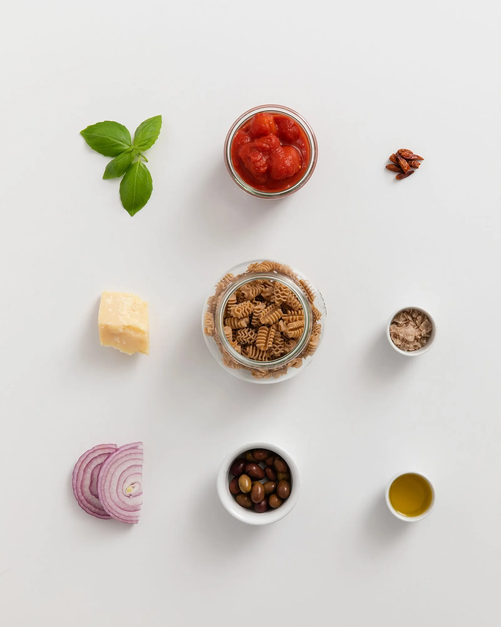 First put the pasta in a 500 ml jar and then add double the weight of cold water and all the ingredients except for the Parmesan cheese. Mix everything and close the jar after cleaning its edge with kitchen paper.