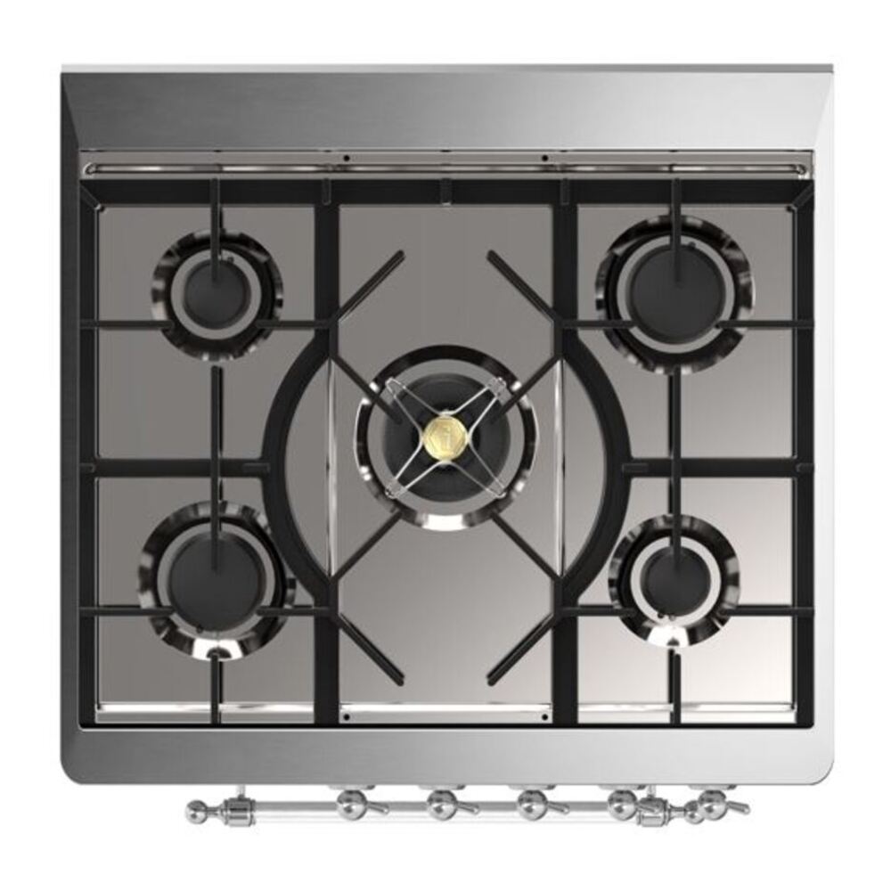 The 30″ Majestic dual fuel range combines the classic Italian style and cutting-edge innovative technology, where form meets function. This range features a 5 gas burner cooktop, equipped with a total black brass burner that has a non-stick nanotechnological coating, boasts a spacious 4 cu. ft. oven capacity and 4.3″ full touch oven control display.