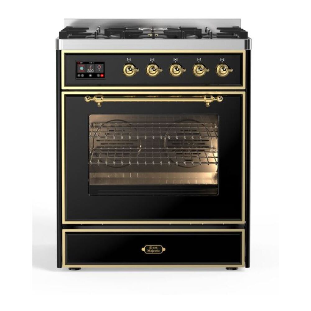 ILVE UM30DNE3BKGLP Majestic II 30 inch Dual Fuel Range with 5 Black Brass Burners (Liquid Propane, Triple Glass Door, Glossy Black, Brass)