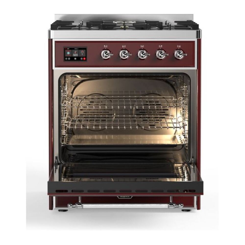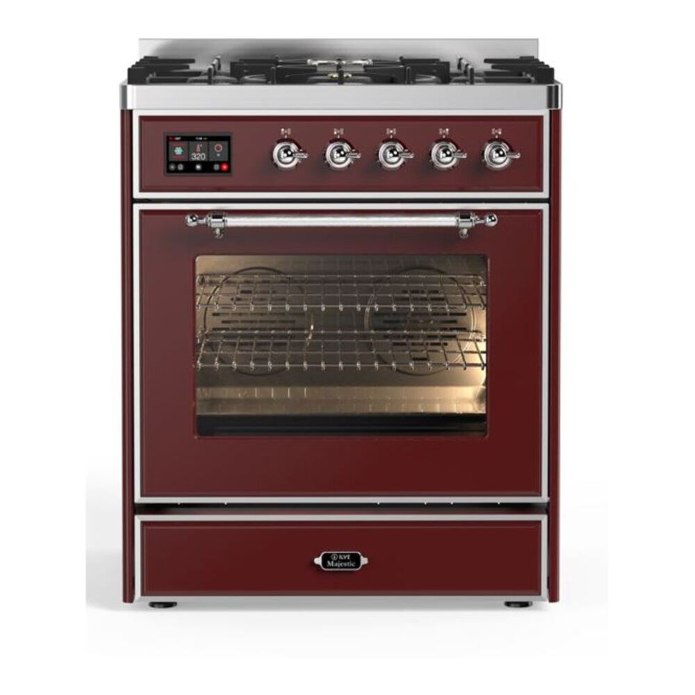 ILVE UM30DNE3BUCLP Majestic II 30 inch Dual Fuel Range with 5 Black Brass Burners (Liquid Propane, Triple Glass Door, Burgundy, Chrome)