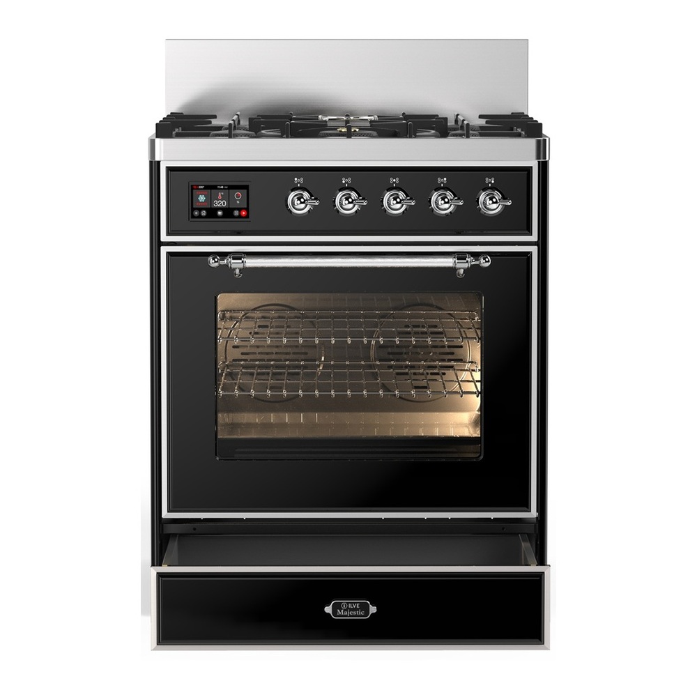 ILVE UM30NR3BKCLP Majestic III 30 inch Dual Fuel Range with 5 Black Brass Burners, Dual Function Burner up to 25,000 BTU (Liquid Propane, Triple Glass Door, Glossy Black, Chrome)