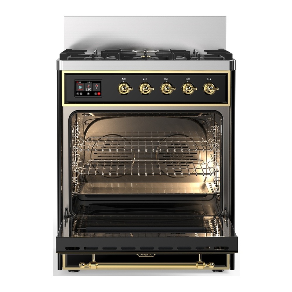 ILVE UM30NR3BKGLP Majestic III 30 inch Dual Fuel Range with 5 Black Brass Burners, Dual Function Burner up to 25,000 BTU (Liquid Propane, Triple Glass Door, Glossy Black, Brass)