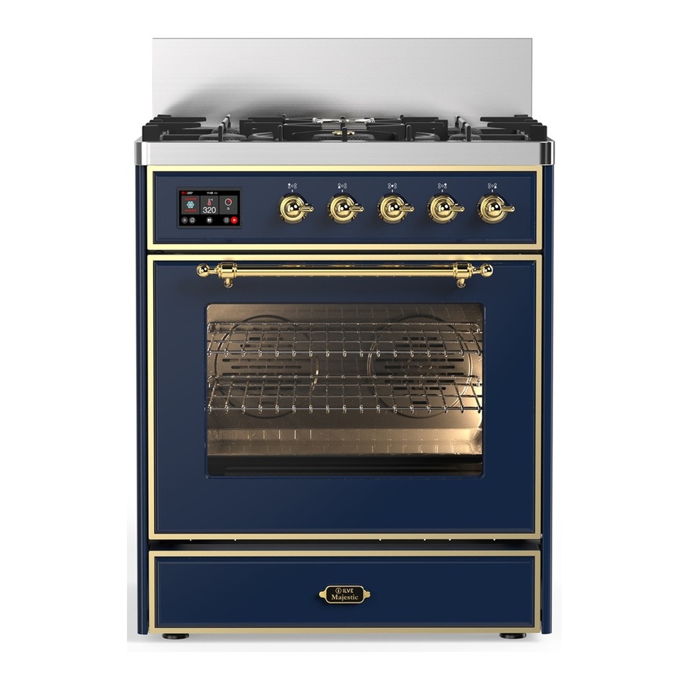 ILVE UM30NR3MBGLP Majestic III 30 inch Dual Fuel Range with 5 Black Brass Burners, Dual Function Burner up to 25,000 BTU (Liquid Propane, Triple Glass Door, Midnight Blue, Brass)