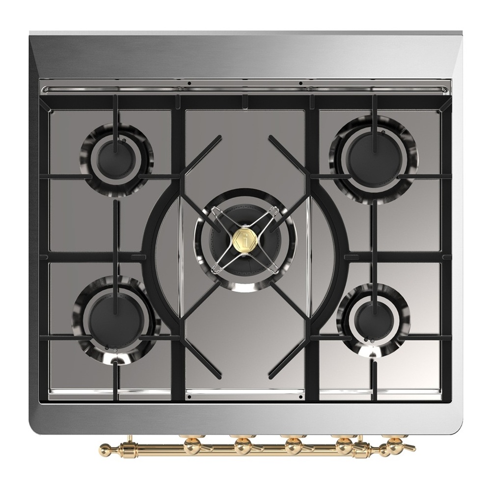 The 30″ Majestic dual fuel range combines the classic Italian style and cutting-edge innovative technology, where form meets function. This range features a 5 gas burner cooktop, equipped with a total black brass burner that has a non-stick nanotechnological coating, boasts a spacious 4 cu. ft. oven capacity and 4.3″ full touch oven control display.