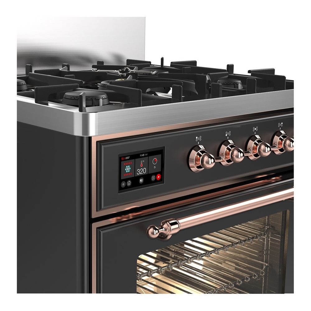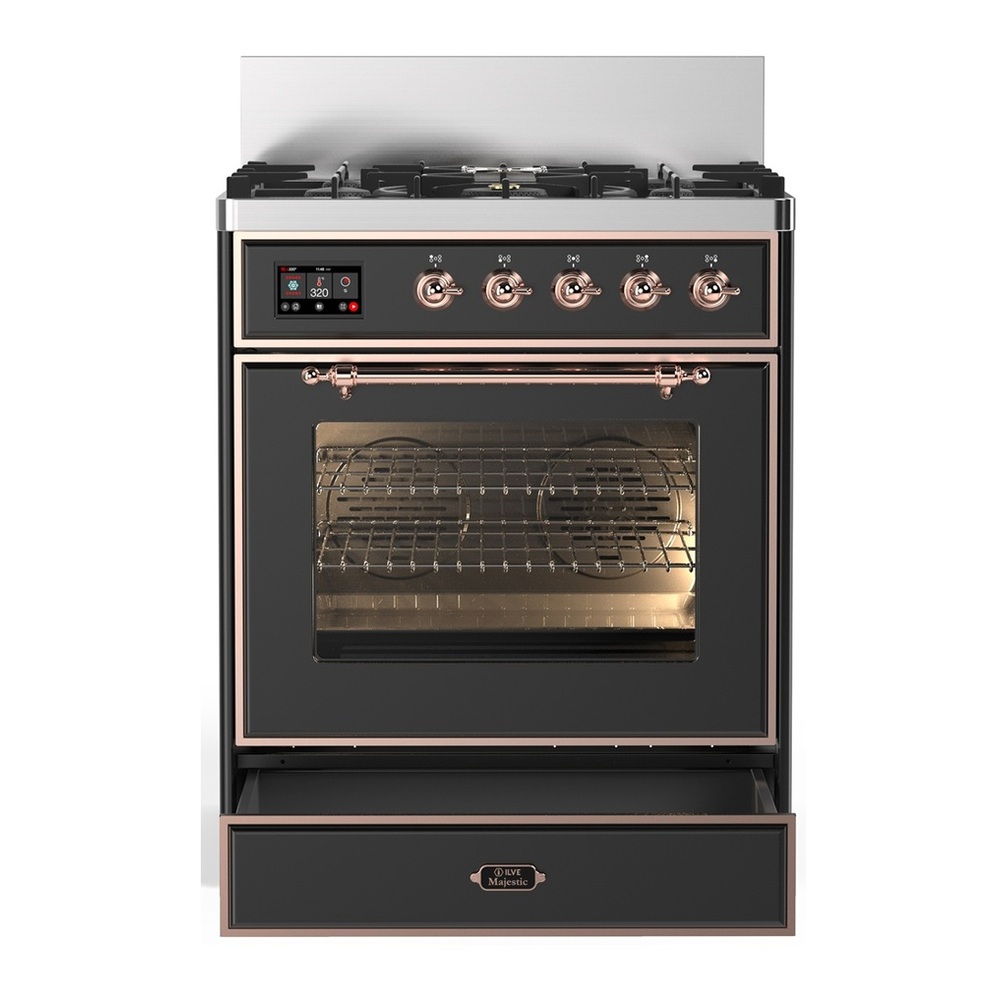 ILVE UM30NR3MGPLP Majestic III 30 inch Dual Fuel Range with 5 Black Brass Burners, Dual Function Burner up to 25,000 BTU (Liquid Propane, Triple Glass Door, Graphite Matte, Copper)