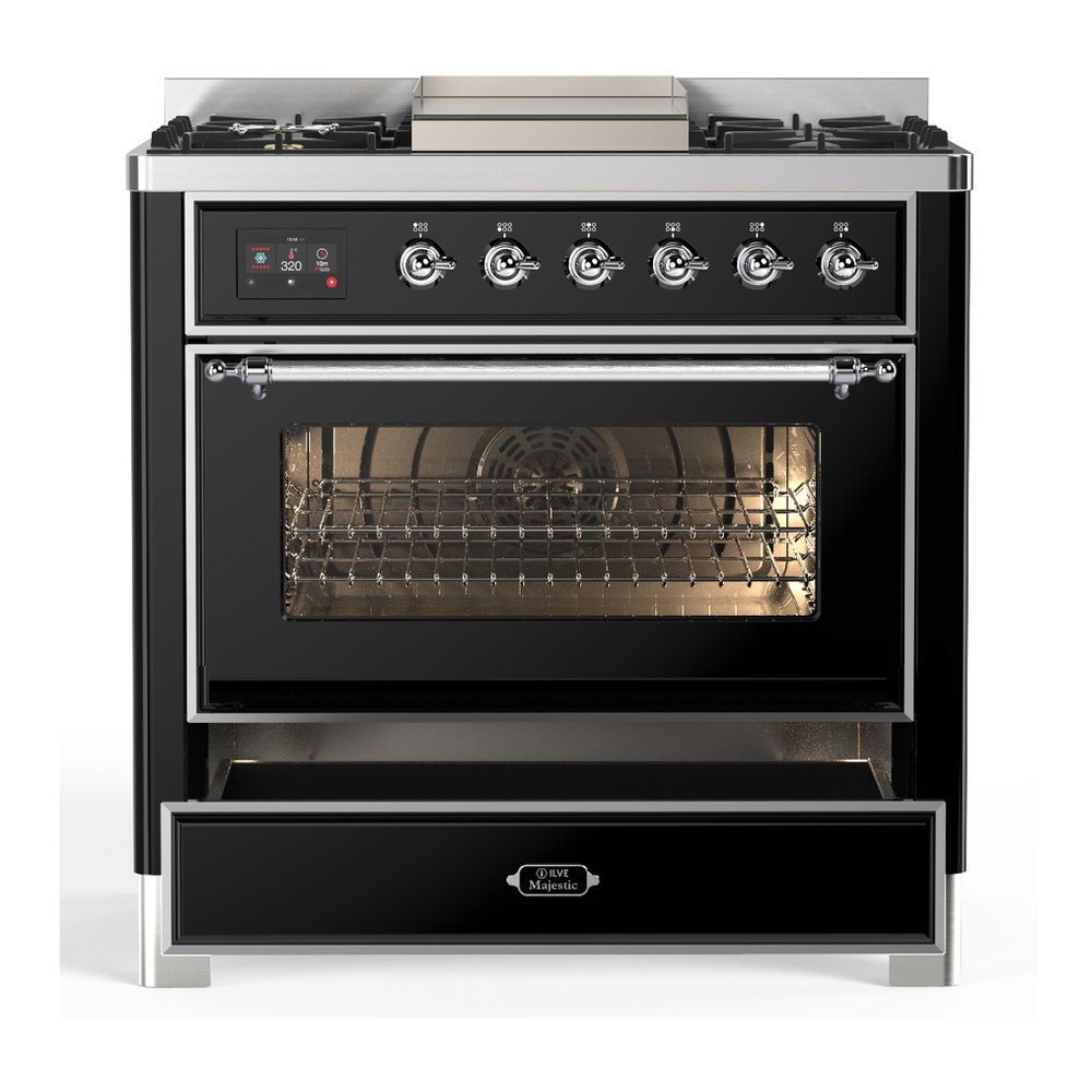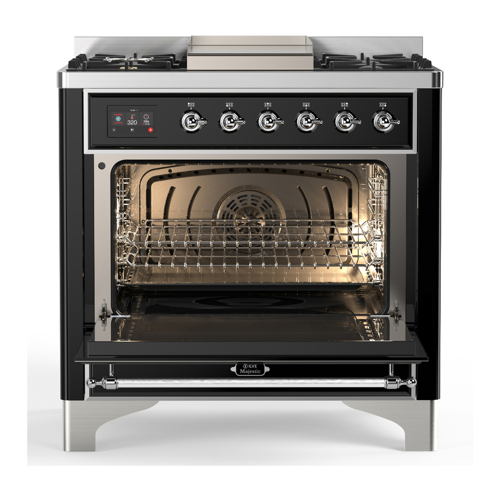 The Majestic 36″ dual fuel range combines the classic Italian style and cutting-edge technology. This range features 6 gas burner and griddle, equipped with a total black brass burner with non-stick nanotechnological coating, 3.5 cu. ft. total oven capacity, 4.3″ full touch oven control display and easy clean enamel oven cavity.