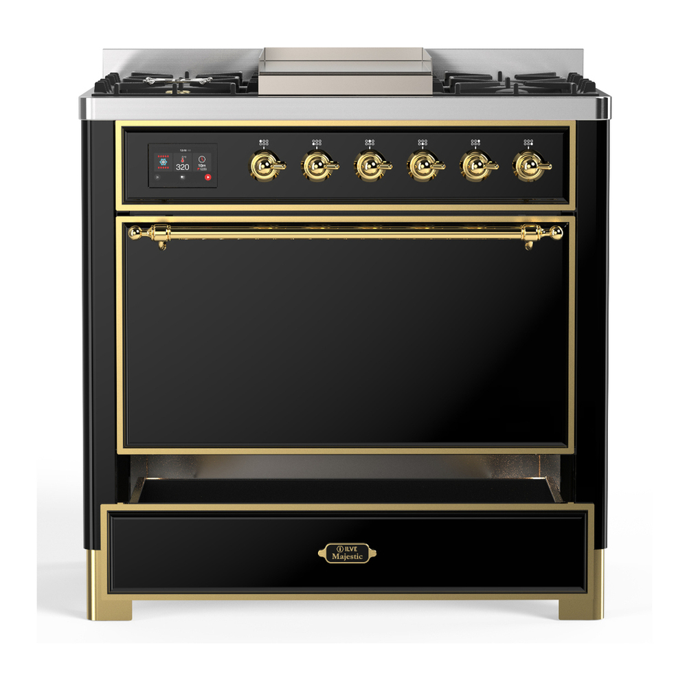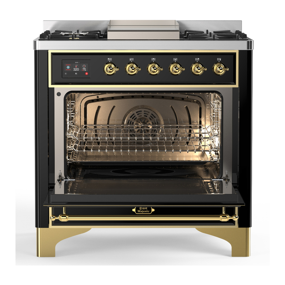 ILVE UM36FQNR3BKGLP Majestic III 36 inch Dual Fuel Range with 6 Black Brass Burners and Griddle, Dual Function Burner up to 25,000 BTU (Solid Door, Glossy Black, Brass, Liquid Propane)