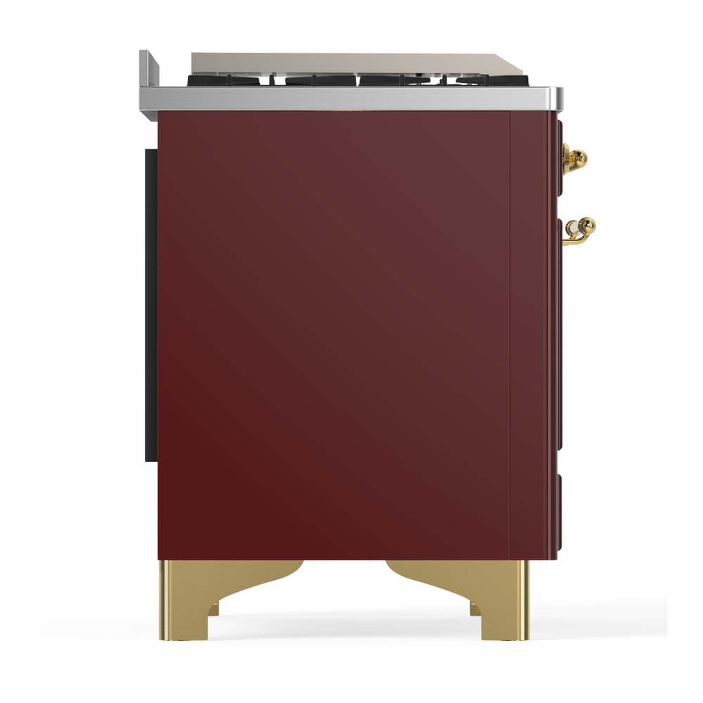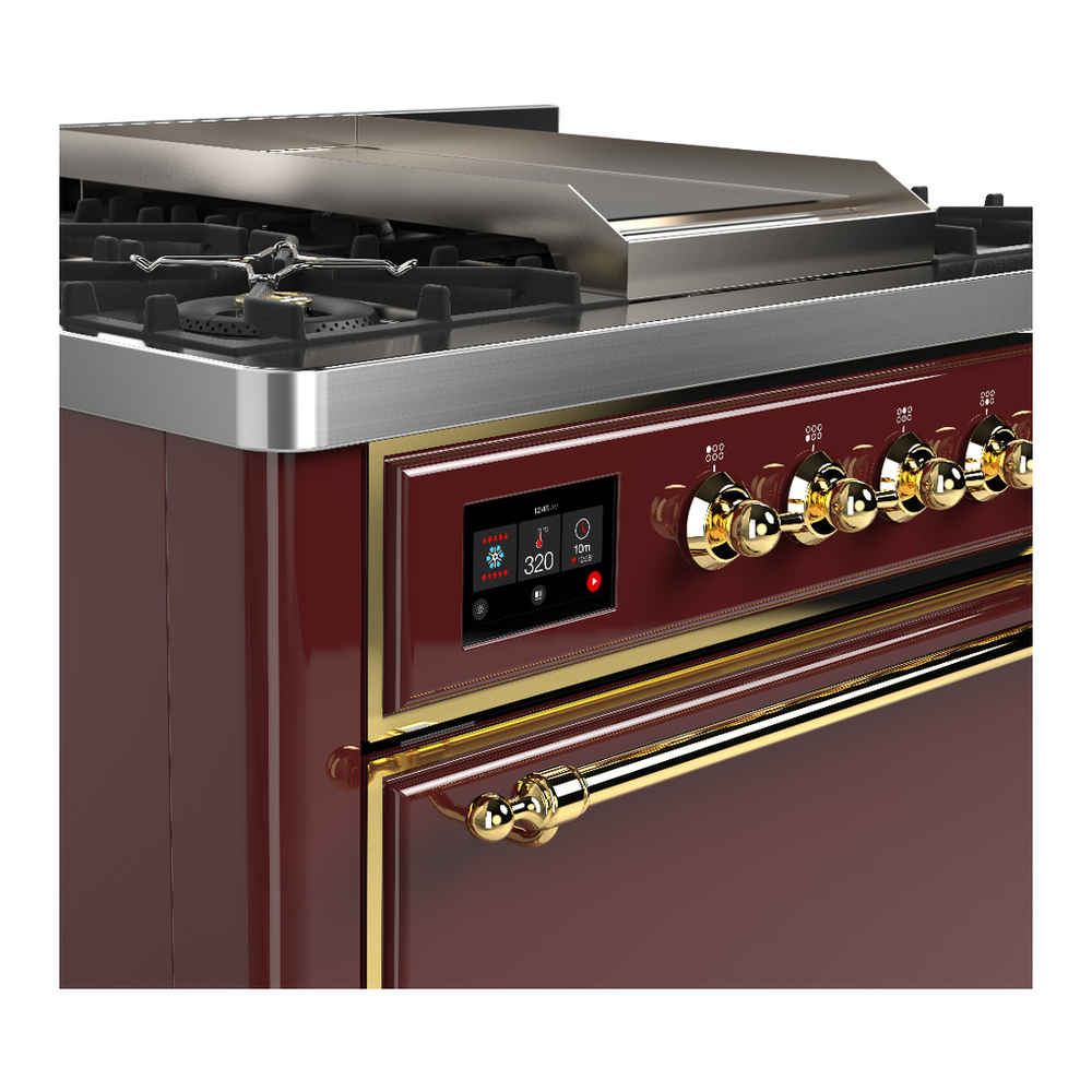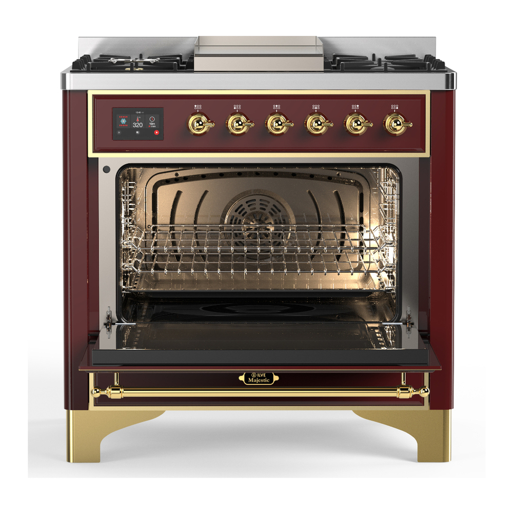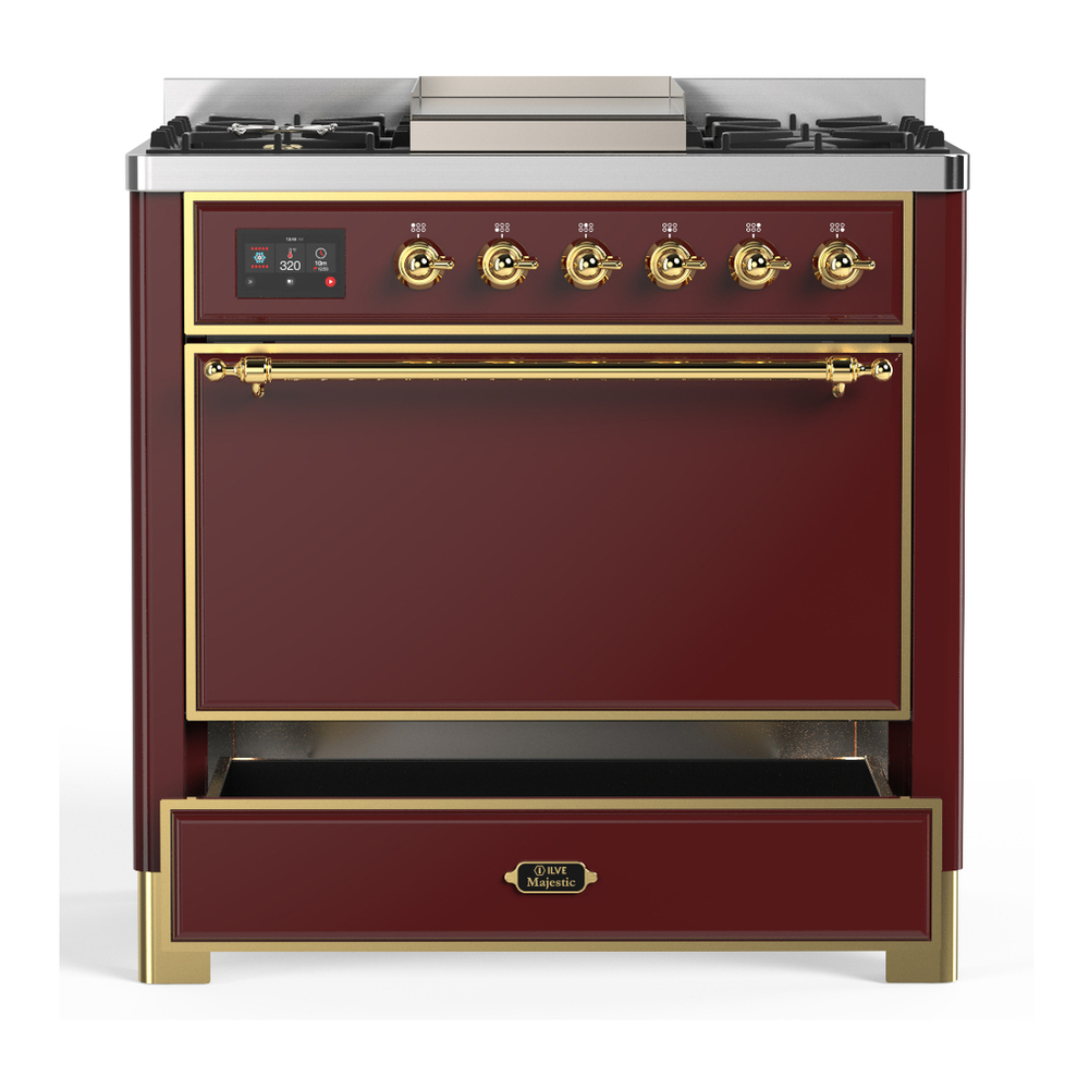 ILVE UM36FQNR3BUGLP Majestic III 36 inch Dual Fuel Range with 6 Black Brass Burners and Griddle, Dual Function Burner up to 25,000 BTU (Solid Door, Burgundy, Brass, Liquid Propane)