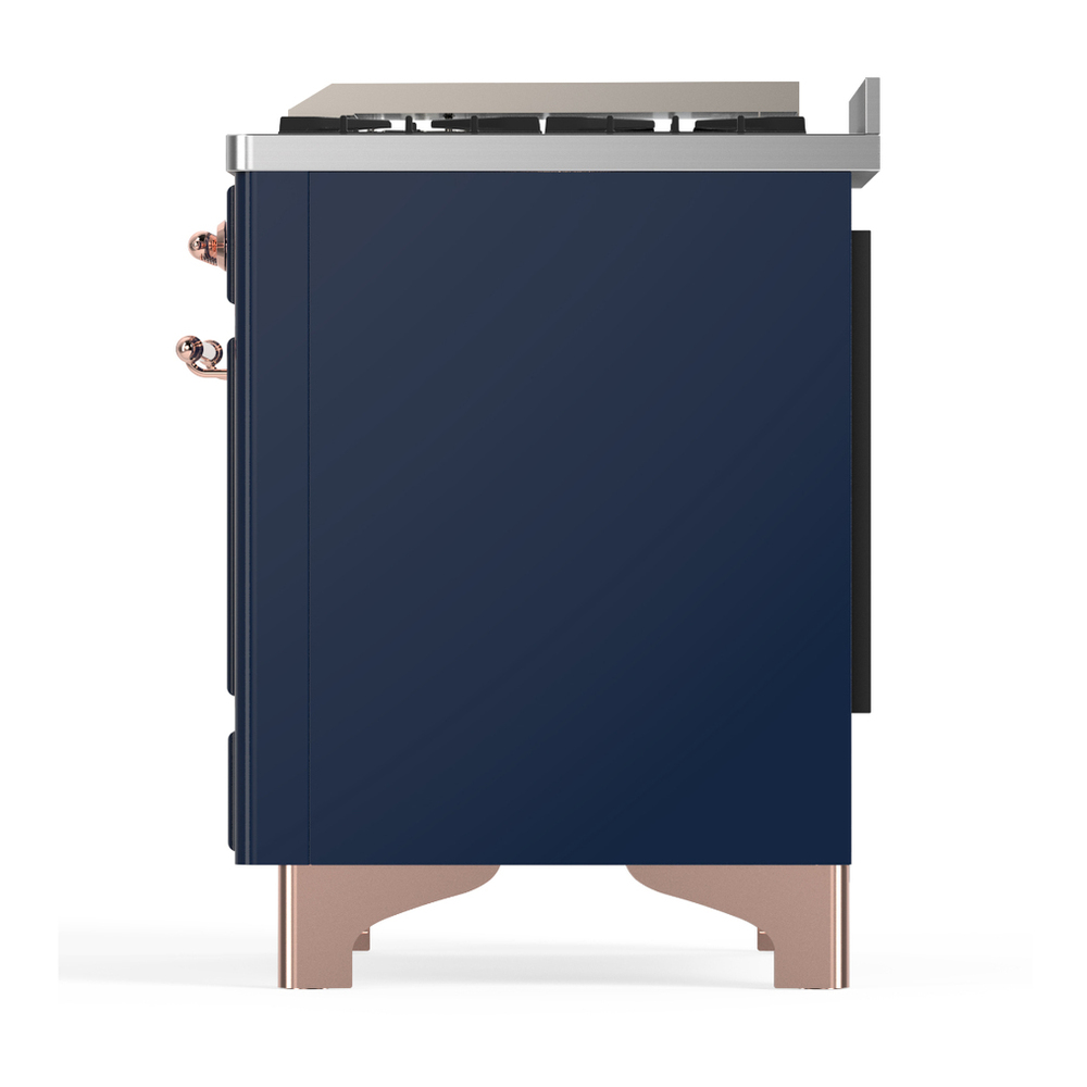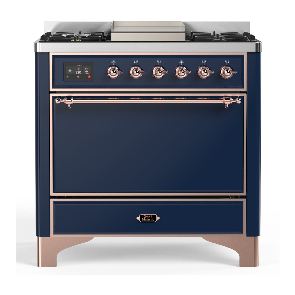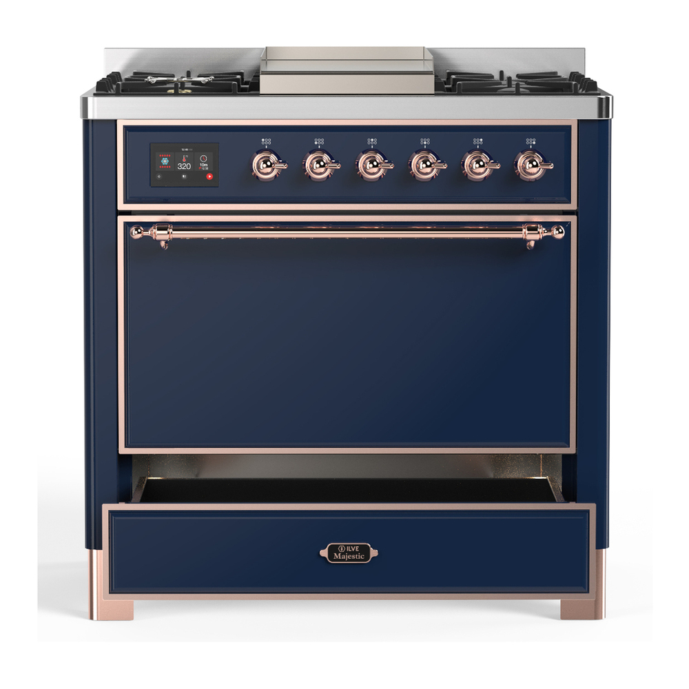 ILVE UM36FQNR3MBPLP Majestic III 36 inch Dual Fuel Range with 6 Black Brass Burners and Griddle, Dual Function Burner up to 25,000 BTU (Solid Door, Midnight Blue, Copper, Liquid Propane)