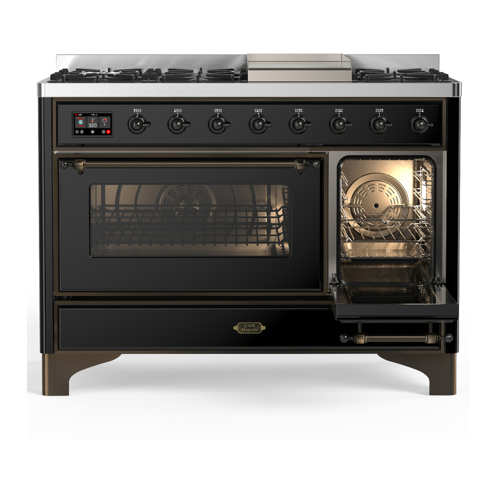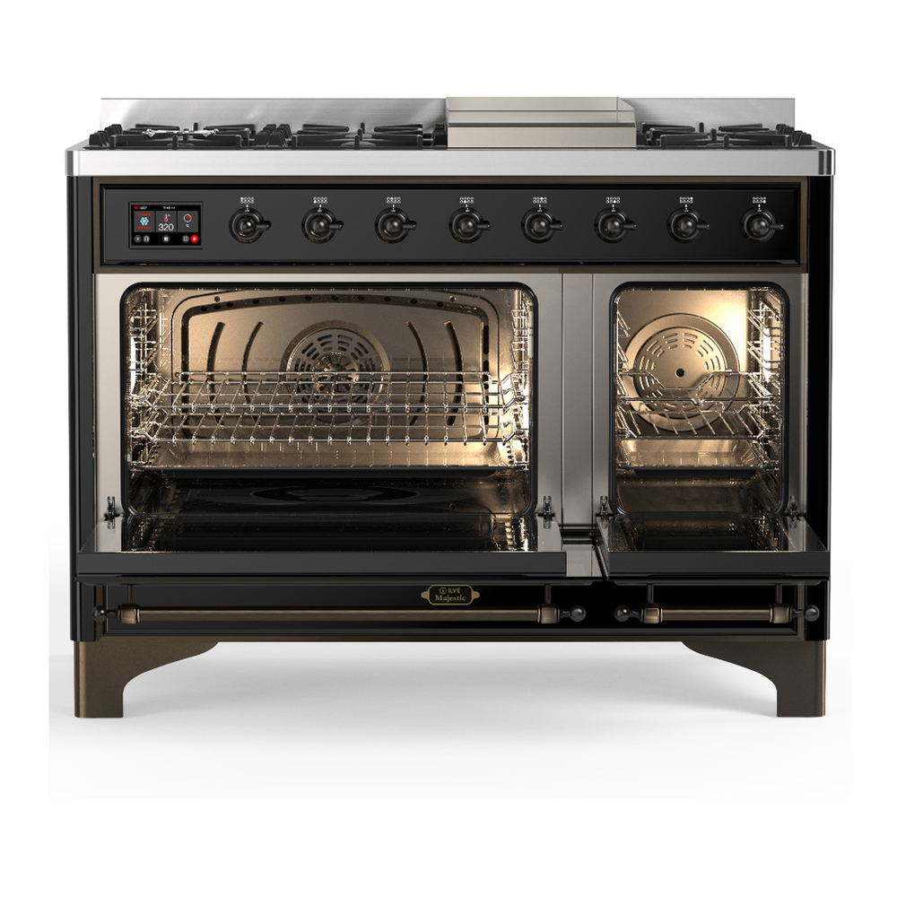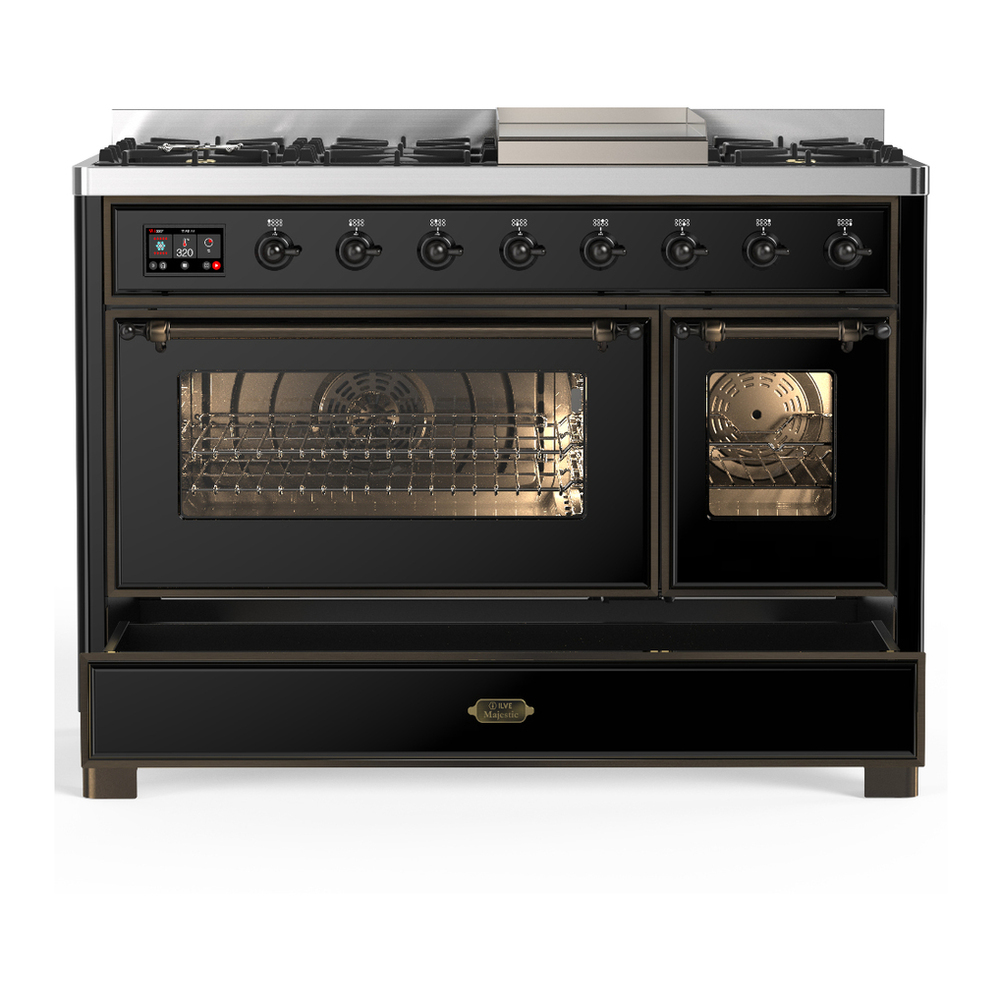 ILVE UM48FNR3BKB Majestic III 48 inch Dual Fuel Range with 8 Burners and Griddle, Dual Function Burner up to 25,000 BTU (Natural Gas, Triple Glass Door, Glossy Black, Burnished)