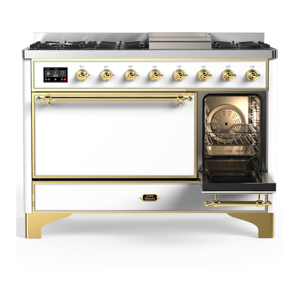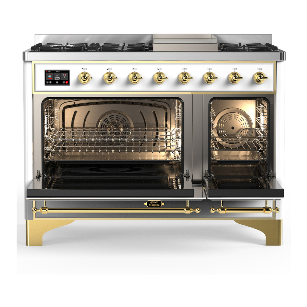 ILVE UM48FQNR3WHG Majestic III 48 inch Dual Fuel Range with 8 Burners and Griddle, Dual Function Burner up to 25,000 BTU (Natural Gas, Solid Door, White, Brass)