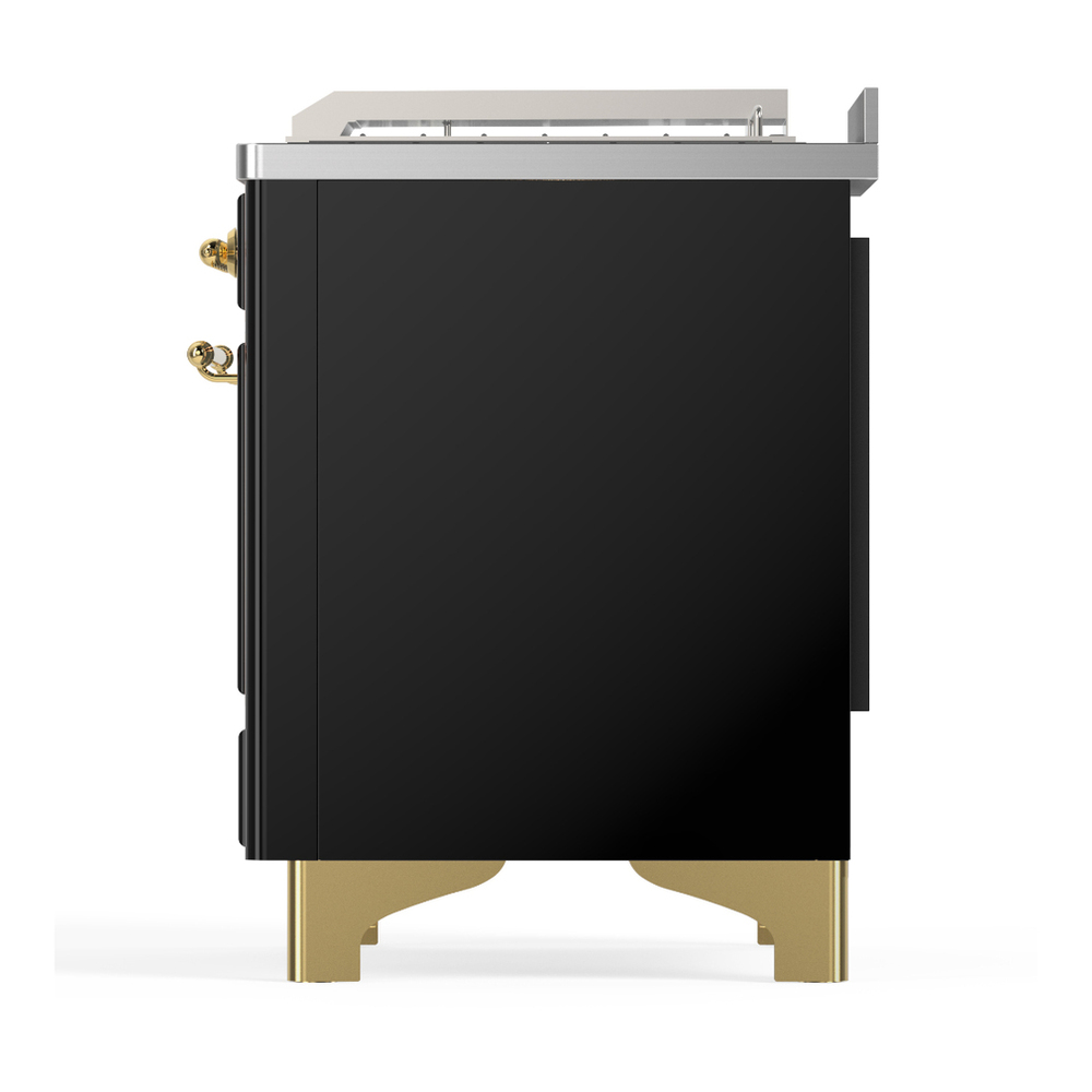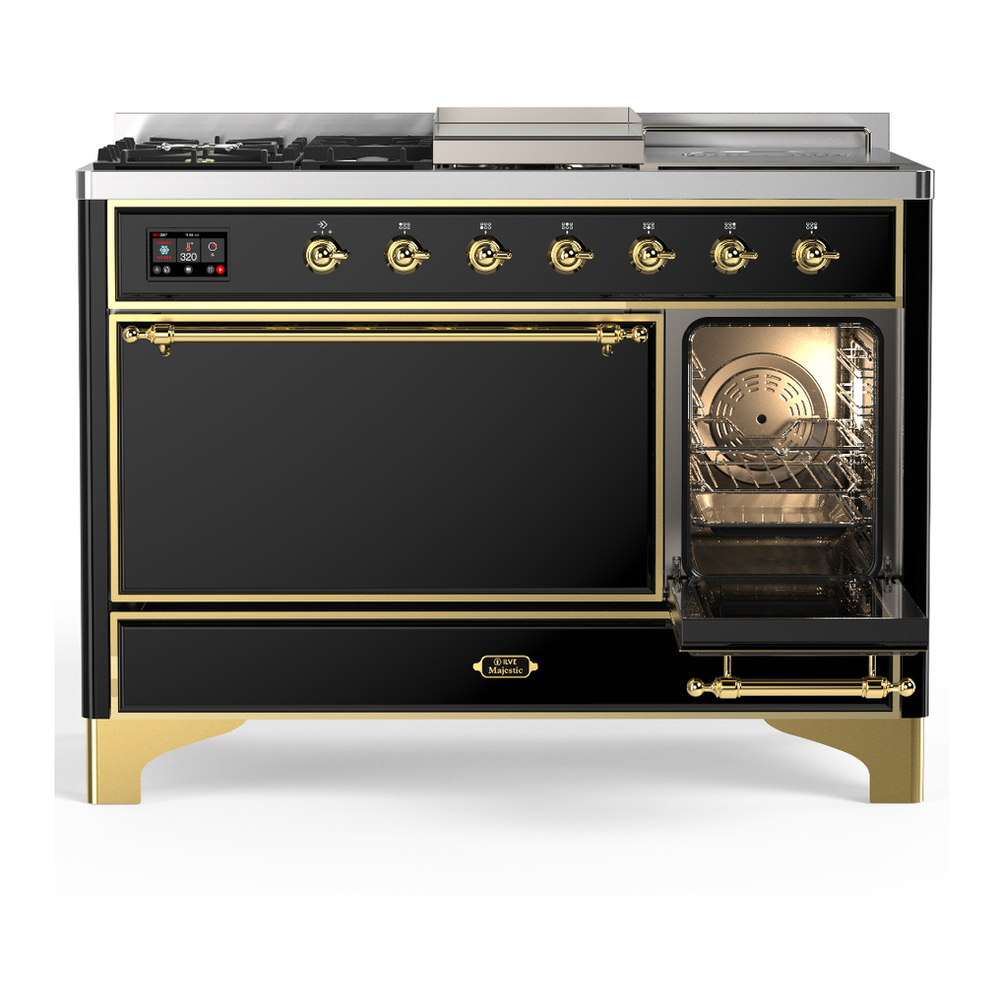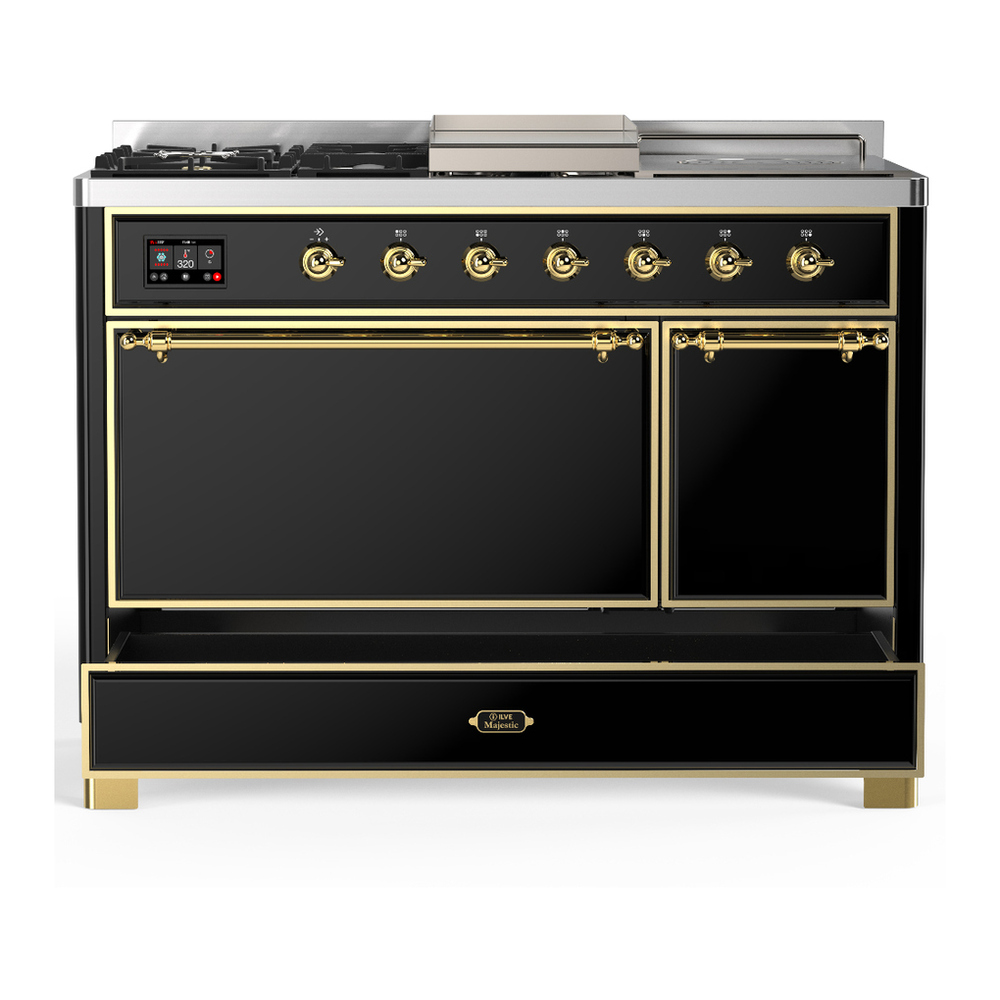 ILVE UM48FSQNR3BKG Majestic III 48 inch Dual Fuel Range with 5 Black Brass Burners, Griddle and French Top, Dual Function Burner up to 25,000 BTU (Natural Gas, Solid Door, Glossy Black, Brass)