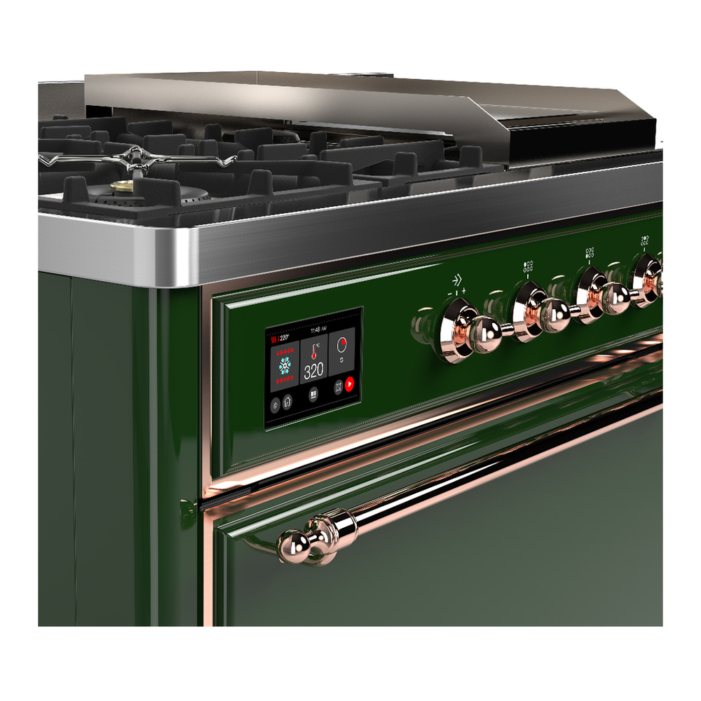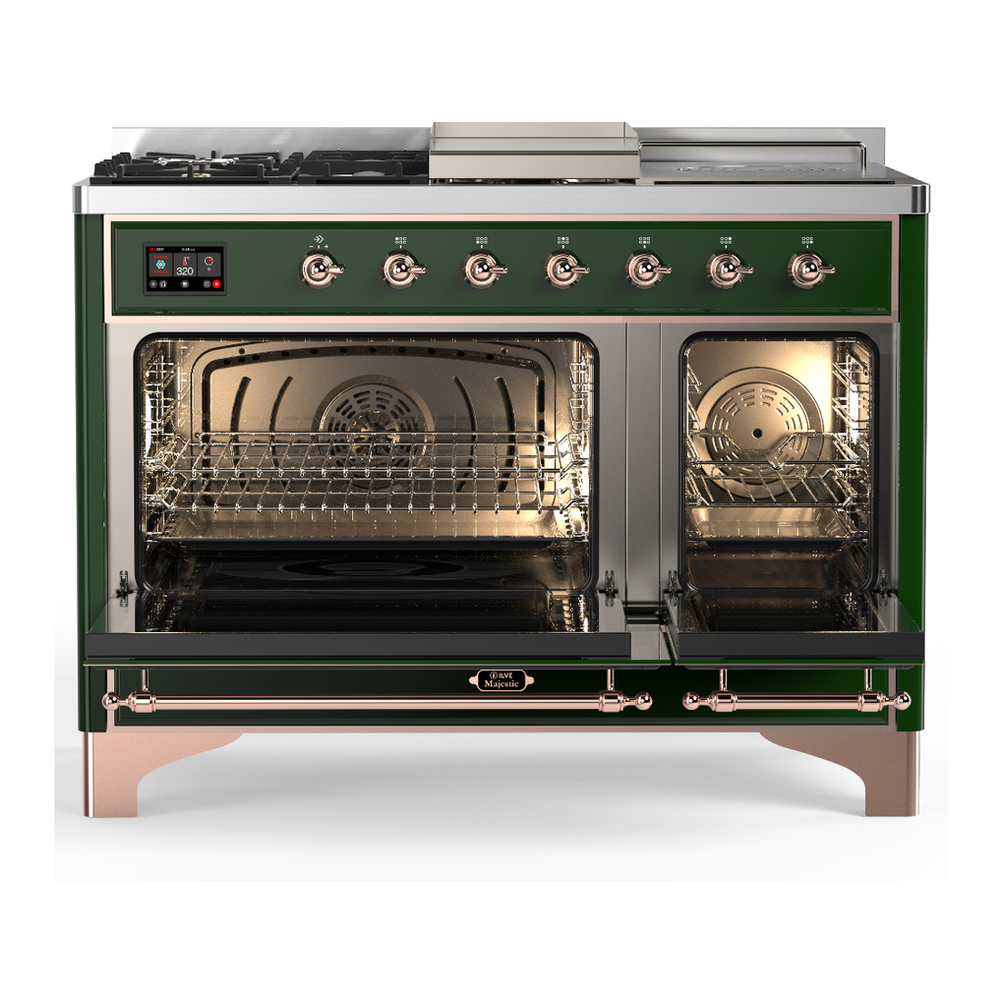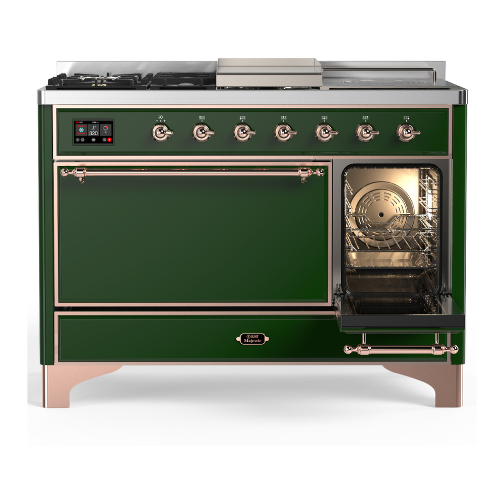 ILVE UM48FSQNR3EGPLP Majestic III 48 inch Dual Fuel Range with 5 Black Brass Burners, Griddle and French Top, Dual Function Burner up to 25,000 BTU (Liquid Propane, Solid Door, Emerald Green, Copper)