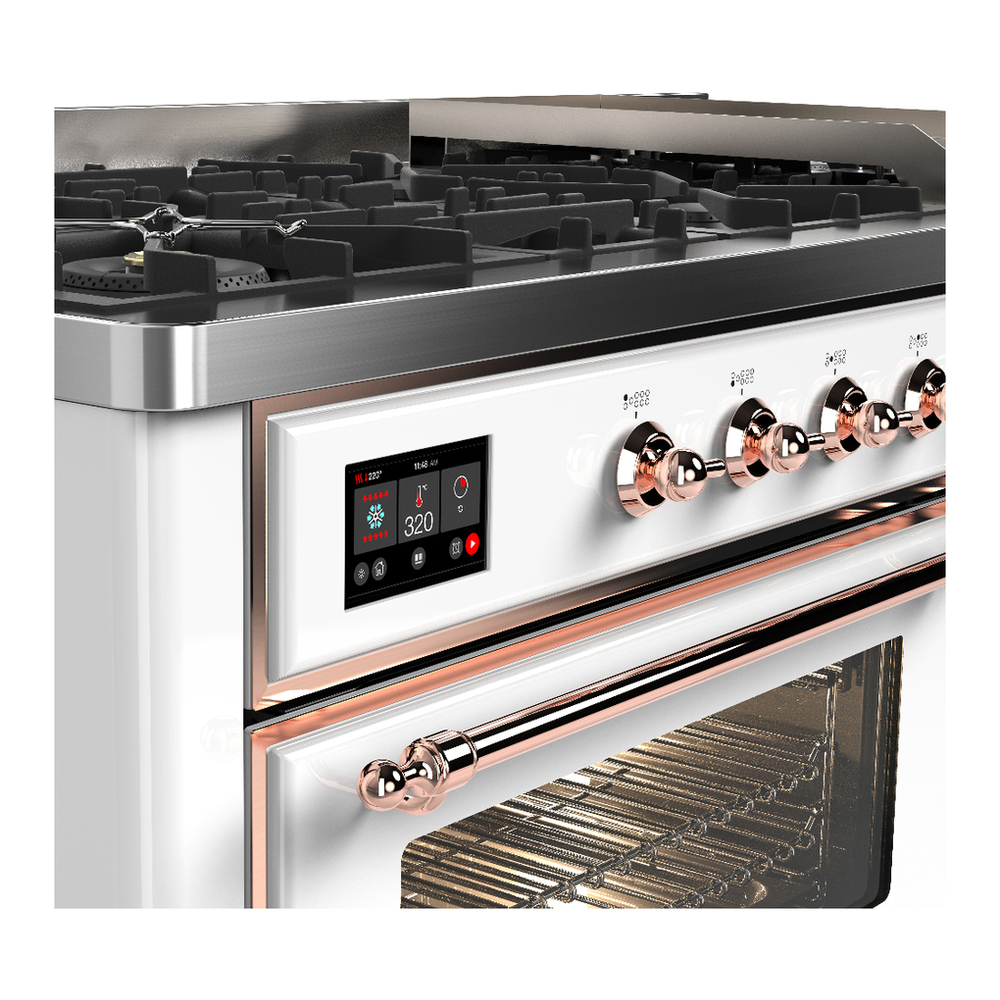 ILVE UM60FNR3WHPLP Majestic III 60 inch Dual Fuel Range with 9 Burners and Griddle, Dual Function Burner up to 25,000 BTU (Liquid Propane, Triple Glass Door, White, Copper)