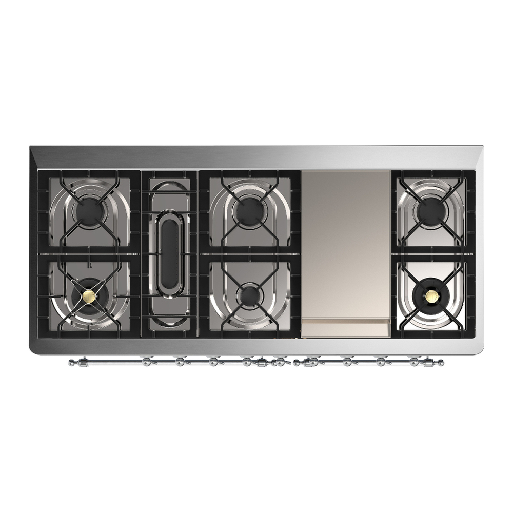 The Majestic 60″ dual fuel range combines the classic Italian style and cutting-edge technology. This range feature 9 gas burners and a griddle, equipped with a total black brass burner with non-stick nanotechnological coating, dual 3.5 + 2.3 cu. ft. total oven capacity, 4.3″ full touch oven control display and easy clean enamel oven cavity.