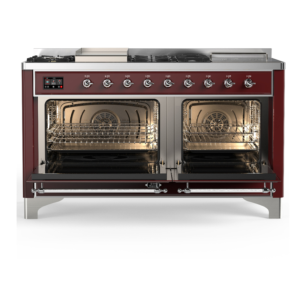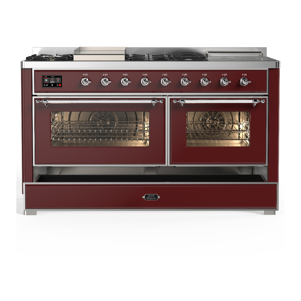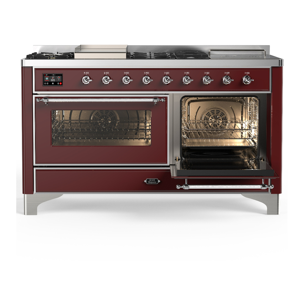 ILVE UM60FSNR3BUC Majestic III 60 inch Dual Fuel Range with 7 Burners, Griddle and French Top, Dual Function Burner with up to 25,000 BTU (Natural Gas, Triple Glass Door, Burgundy, Chrome)