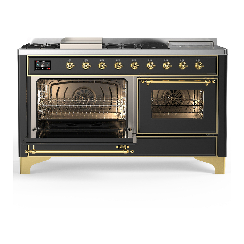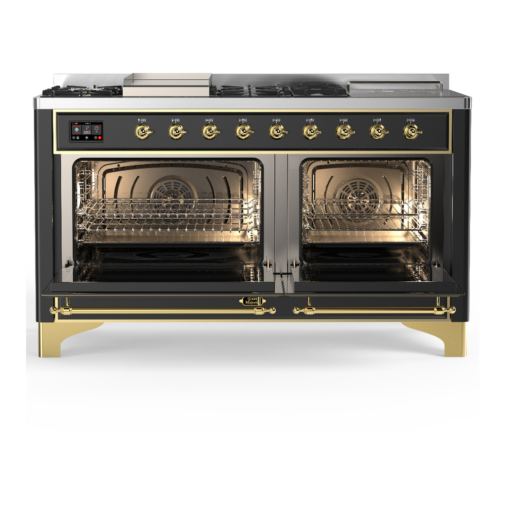 ILVE UM60FSNR3MGG Majestic III 60 inch Dual Fuel Range with 7 Burners, Griddle and French Top, Dual Function Burner with up to 25,000 BTU (Natural Gas, Triple Glass Door, Graphite Matte, Brass)