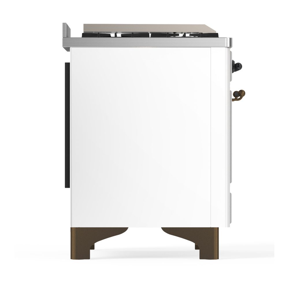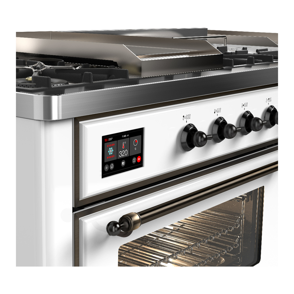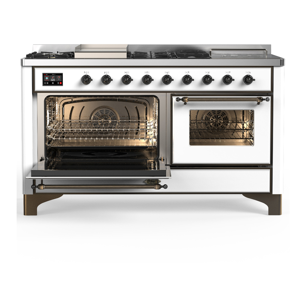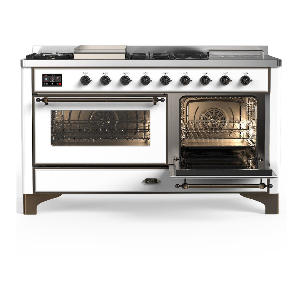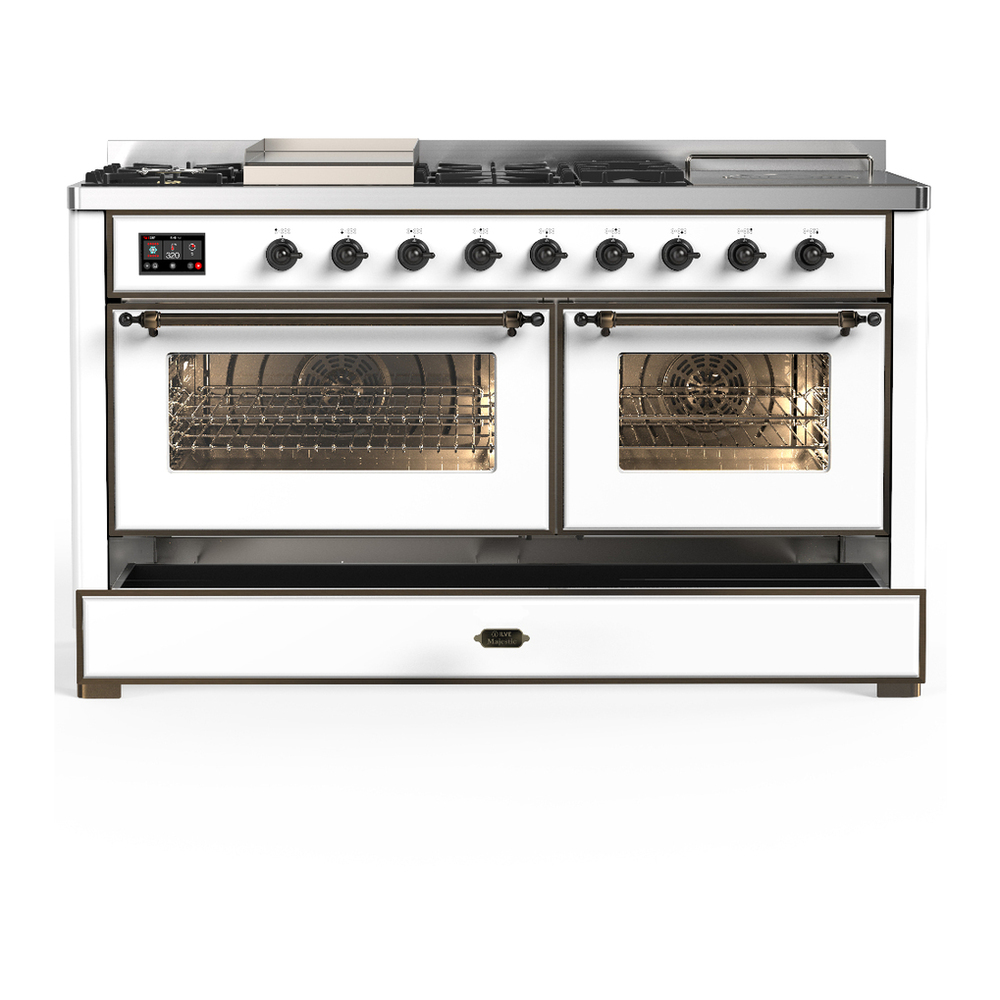 ILVE UM60FSNR3WHBLP Majestic III 60 inch Dual Fuel Range with 7 Burners, Griddle and French Top, Dual Function Burner with up to 25,000 BTU (Liquid Propane, Triple Glass Door, White, Burnished)