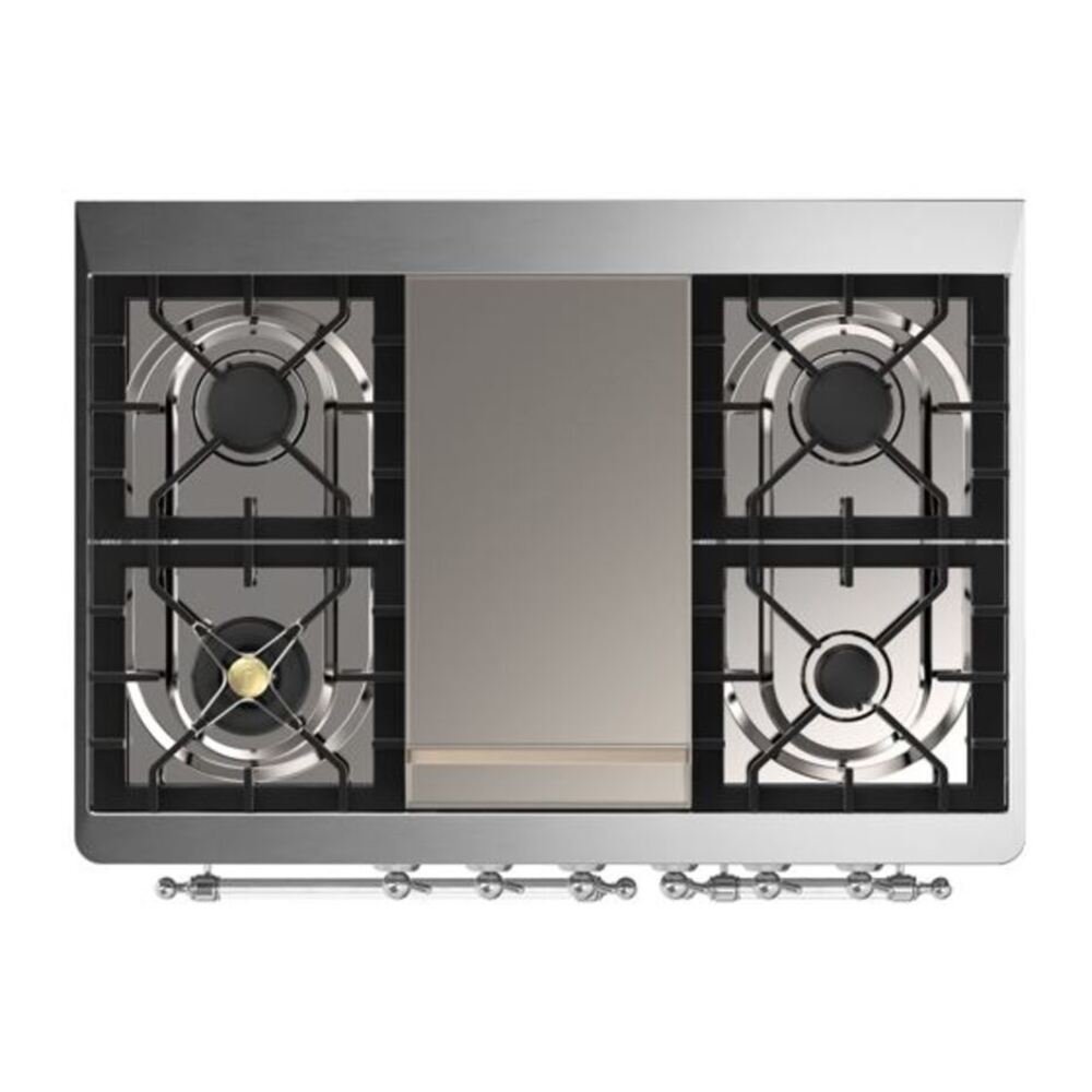 The Majestic 40″ dual fuel range combines the classic Italian style and cutting-edge technology. This range features 6 gas burner and griddle, equipped with a total black brass burner with non-stick nanotechnological coating, dual 2.3 + 1.52 cu. ft. total oven capacity, 4.3″ full touch oven control display and easy clean enamel oven cavity.