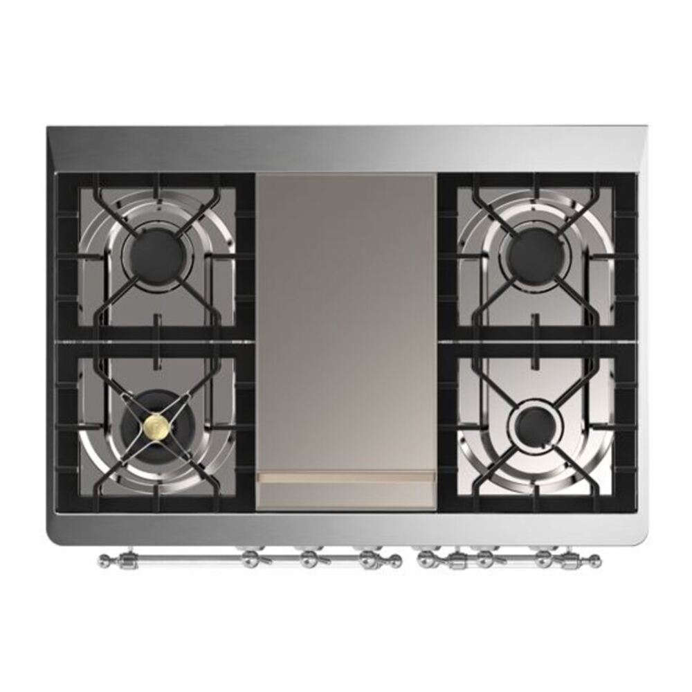The Majestic 40″ dual fuel range combines the classic Italian style and cutting-edge technology. This range features 6 gas burner and griddle, equipped with a total black brass burner with non-stick nanotechnological coating, dual 2.3 + 1.52 cu. ft. total oven capacity, 4.3″ full touch oven control display and easy clean enamel oven cavity.