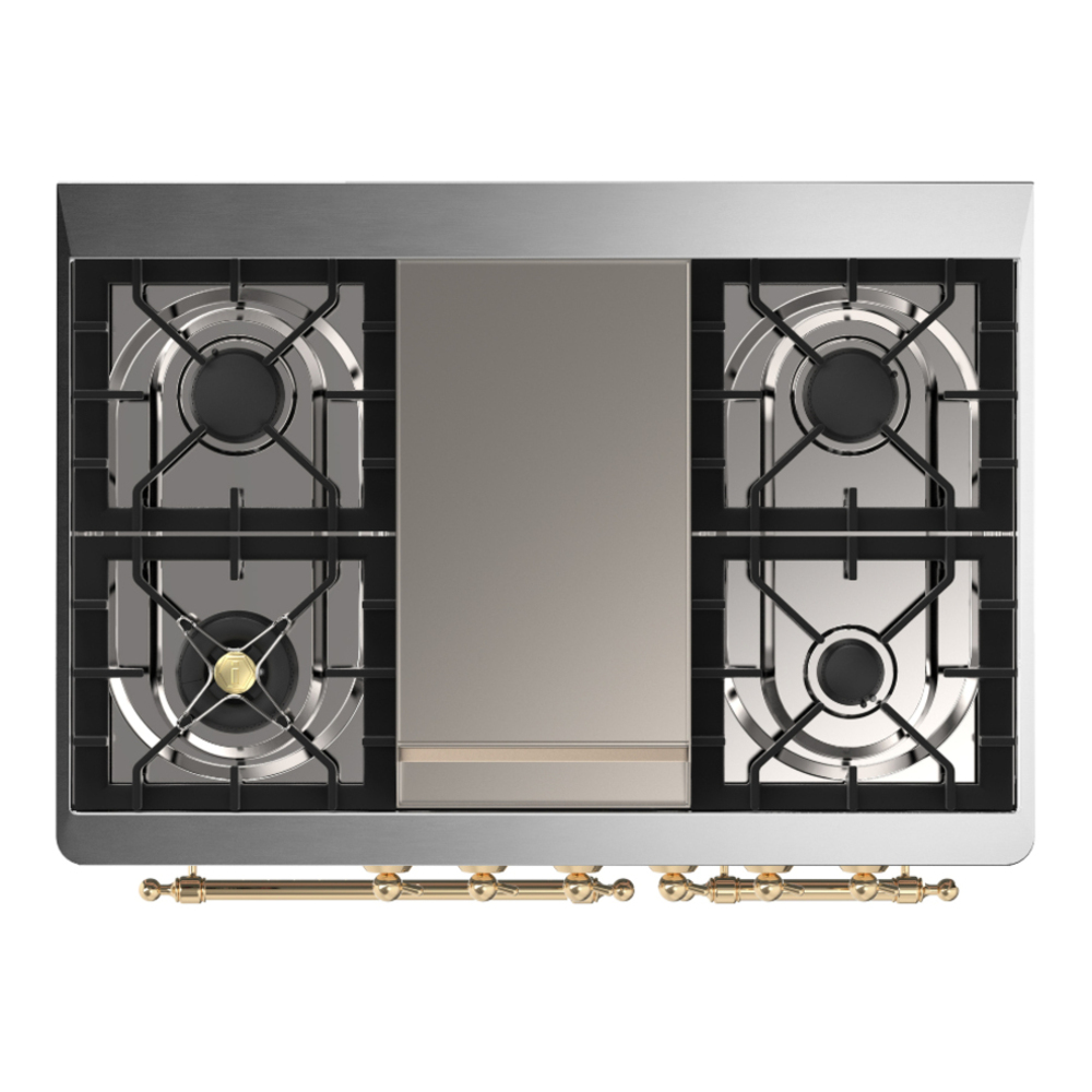 The Majestic 40″ dual fuel range combines the classic Italian style and cutting-edge technology. This range features 6 gas burner and griddle, equipped with a total black brass burner with non-stick nanotechnological coating, dual 2.3 + 1.52 cu. ft. total oven capacity, 4.3″ full touch oven control display and easy clean enamel oven cavity.