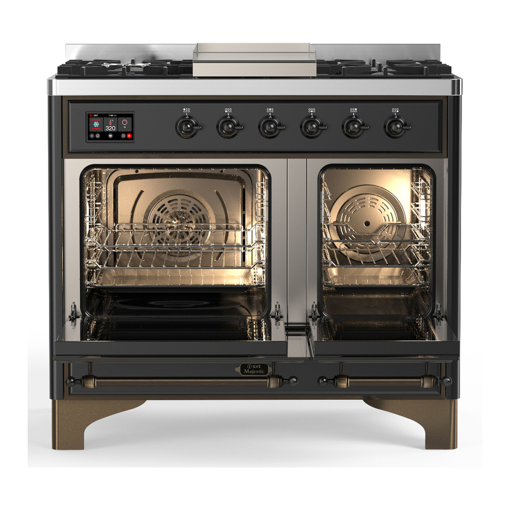 The Majestic 40″ dual fuel range combines the classic Italian style and cutting-edge technology. This range features 6 gas burner and griddle, equipped with a total black brass burner with non-stick nanotechnological coating, dual 2.3 + 1.52 cu. ft. total oven capacity, 4.3″ full touch oven control display and easy clean enamel oven cavity.