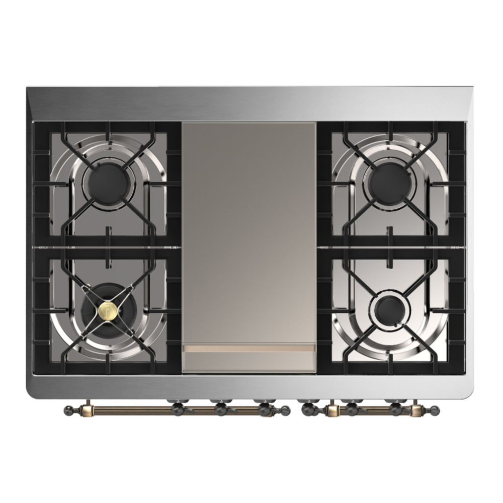 The Majestic 40″ dual fuel range combines the classic Italian style and cutting-edge technology. This range features 6 gas burner and griddle, equipped with a total black brass burner with non-stick nanotechnological coating, dual 2.3 + 1.52 cu. ft. total oven capacity, 4.3″ full touch oven control display and easy clean enamel oven cavity.