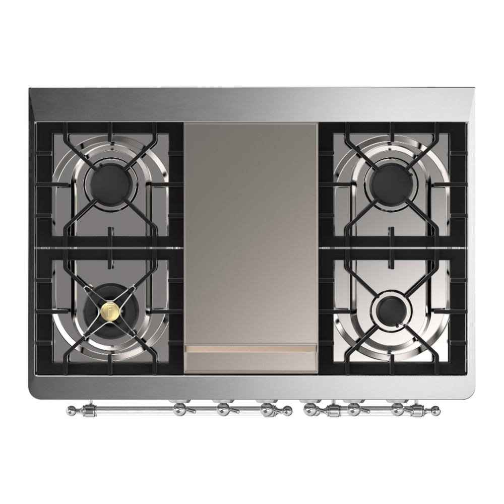 The Majestic 40″ dual fuel range combines the classic Italian style and cutting-edge technology. This range features 6 gas burner and griddle, equipped with a total black brass burner with non-stick nanotechnological coating, dual 2.3 + 1.52 cu. ft. total oven capacity, 4.3″ full touch oven control display and easy clean enamel oven cavity.