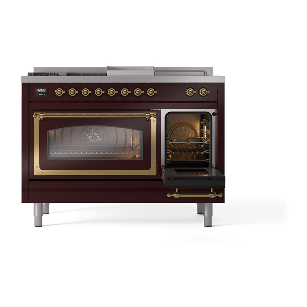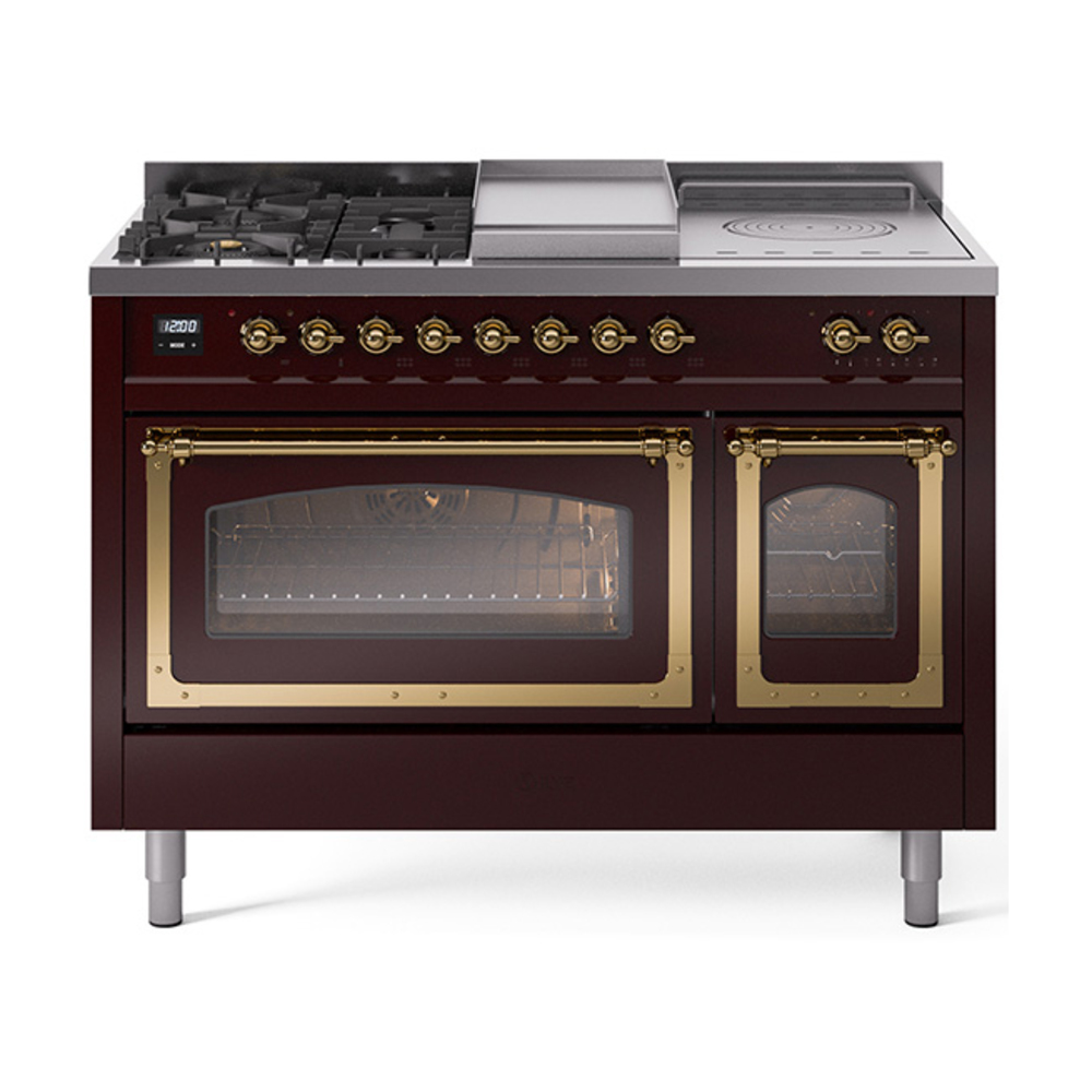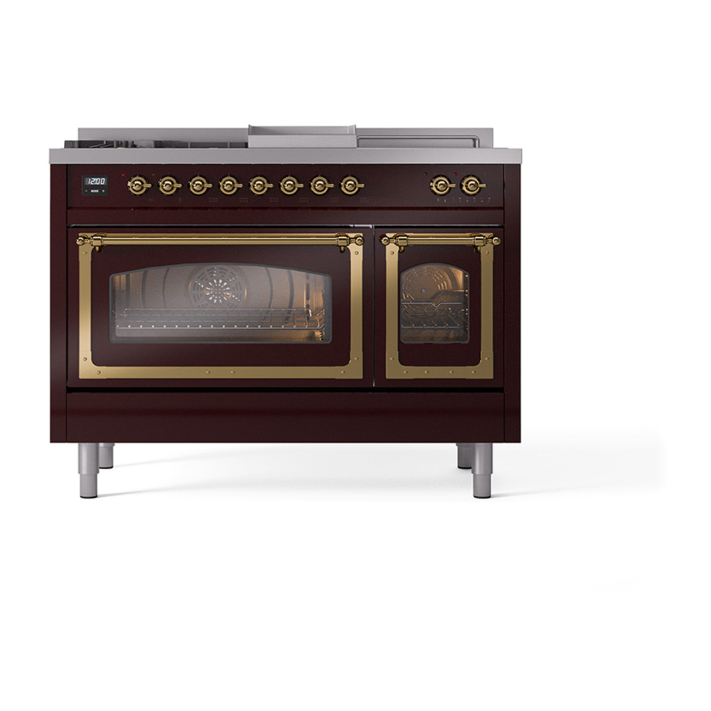 ILVE UN48FSNMPBUG Nostalgie II Noblesse 48 inch Dual Fuel Range (5 Sealed Burners + Griddle + French Top, Natural Gas, Triple Glass Door, Burgundy, Brass)