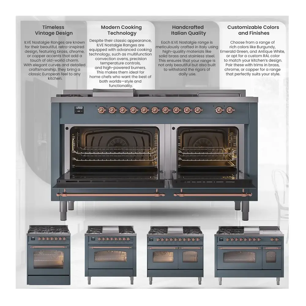 Nostalgie range cookers integrate highly professional technologies and excellent materials with a classic style that is always inspiring. Undisputed protagonists of the kitchen, they offer a complete choice of sizes (from 30 to 60 inches) and various configurations: you can choose the flush-top induction up to 6 cooking zones with bridge function for 48 inches version, single or double oven, standard colors or RAL colors on request, various finishes and accessories. Only available as an option for the Nostalgie collection, Noblesse frames are more than just a detail: they are a fine design feature that frames the front panels, matching the metallic finishes of the handles and knobs. The blind door inspired by the past is another option that elegantly enriches the style of Nostalgie.