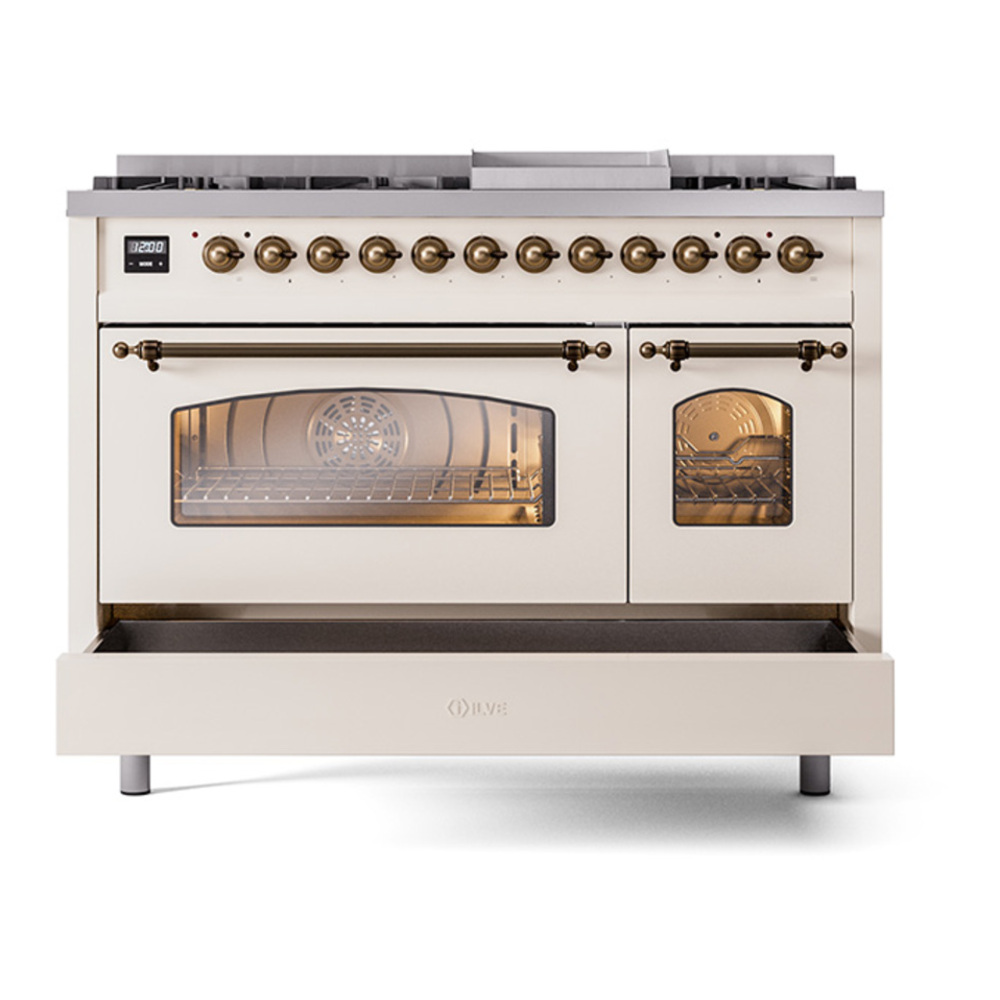ILVE UP48FNMPAWB Nostalgie II 48 inch Dual Fuel Range with 5.02 cu. ft. Total Double Oven Capacity (8 Sealed Burners + Griddle, Natural Gas, Triple Glass Door, Antique White, Burnished)