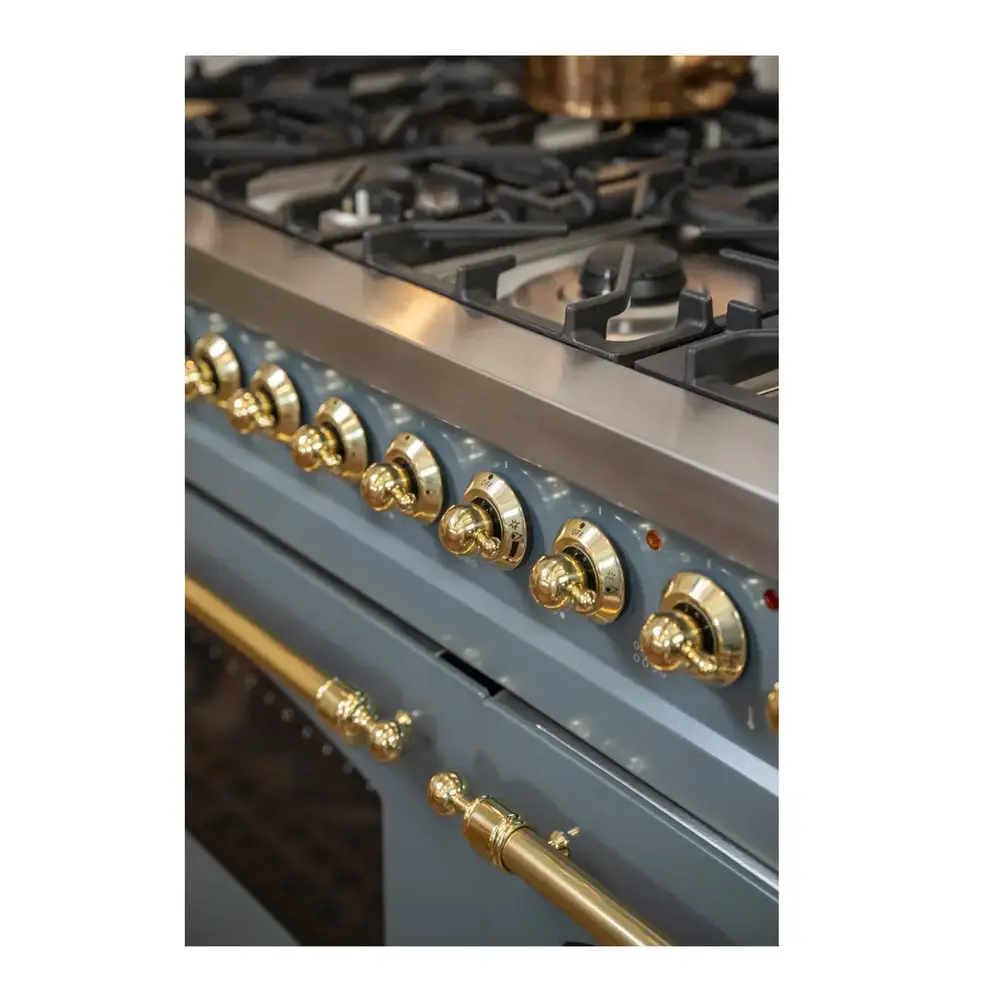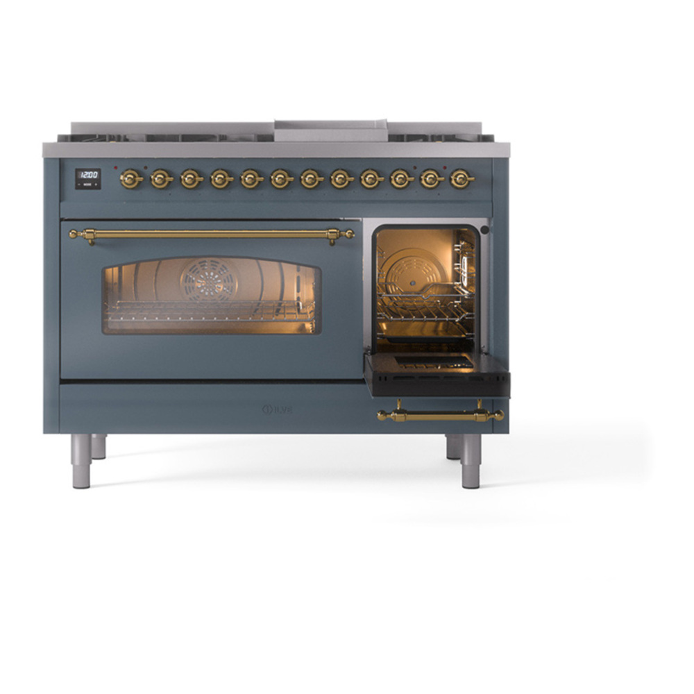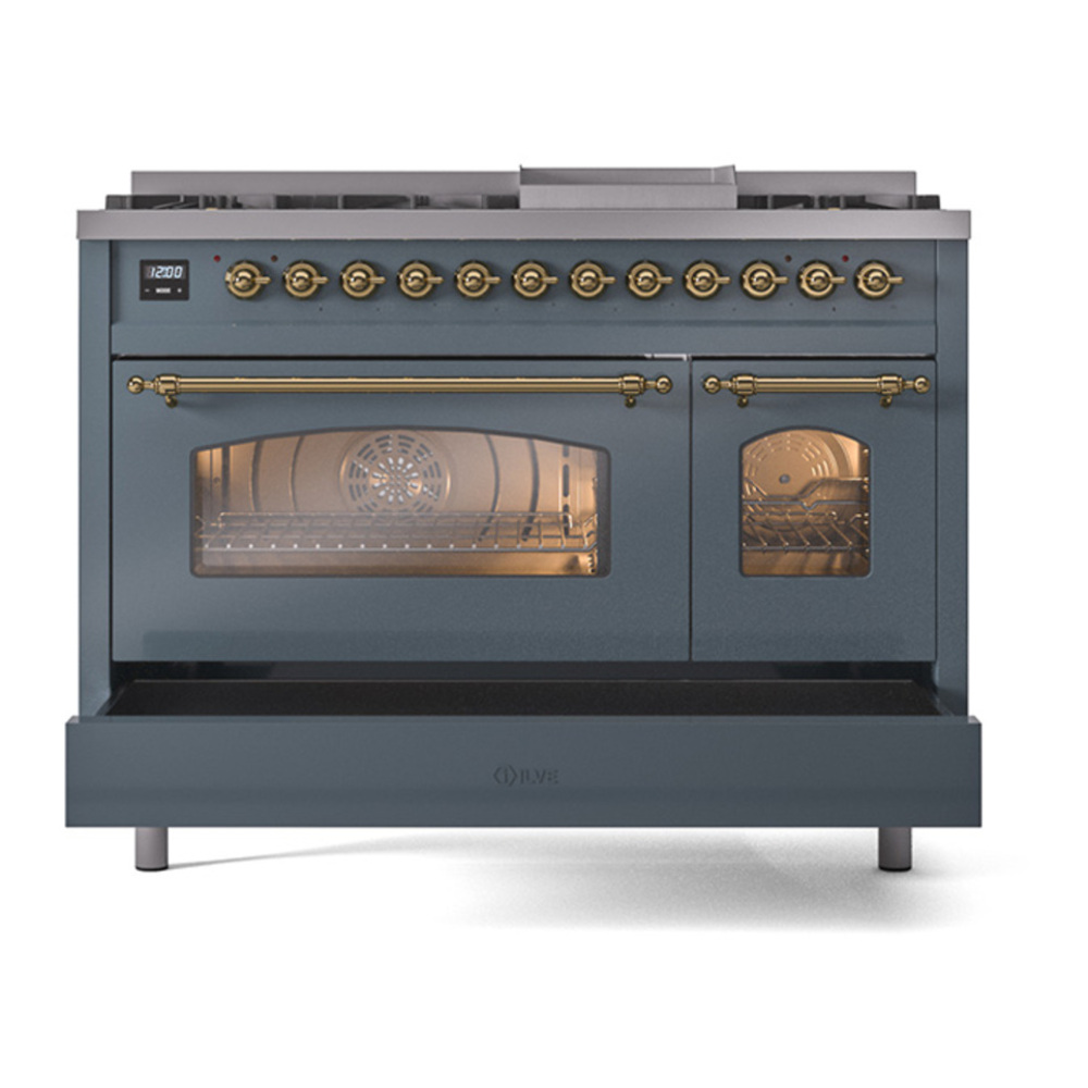 ILVE UP48FNMPBGGLP Nostalgie II 48 inch Dual Fuel Range with 5.02 cu. ft. Total Double Oven Capacity (8 Sealed Burners + Griddle, Liquid Propane, Triple Glass Door, Blue Grey, Brass)