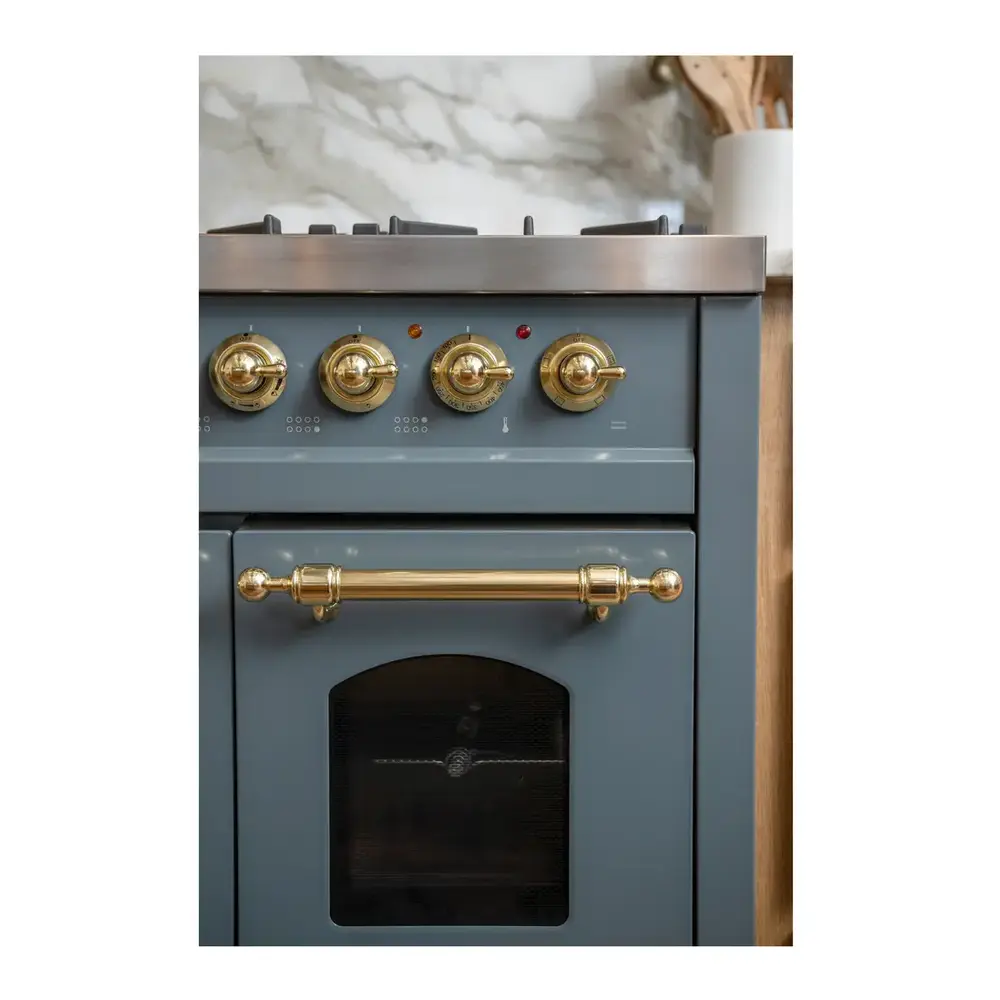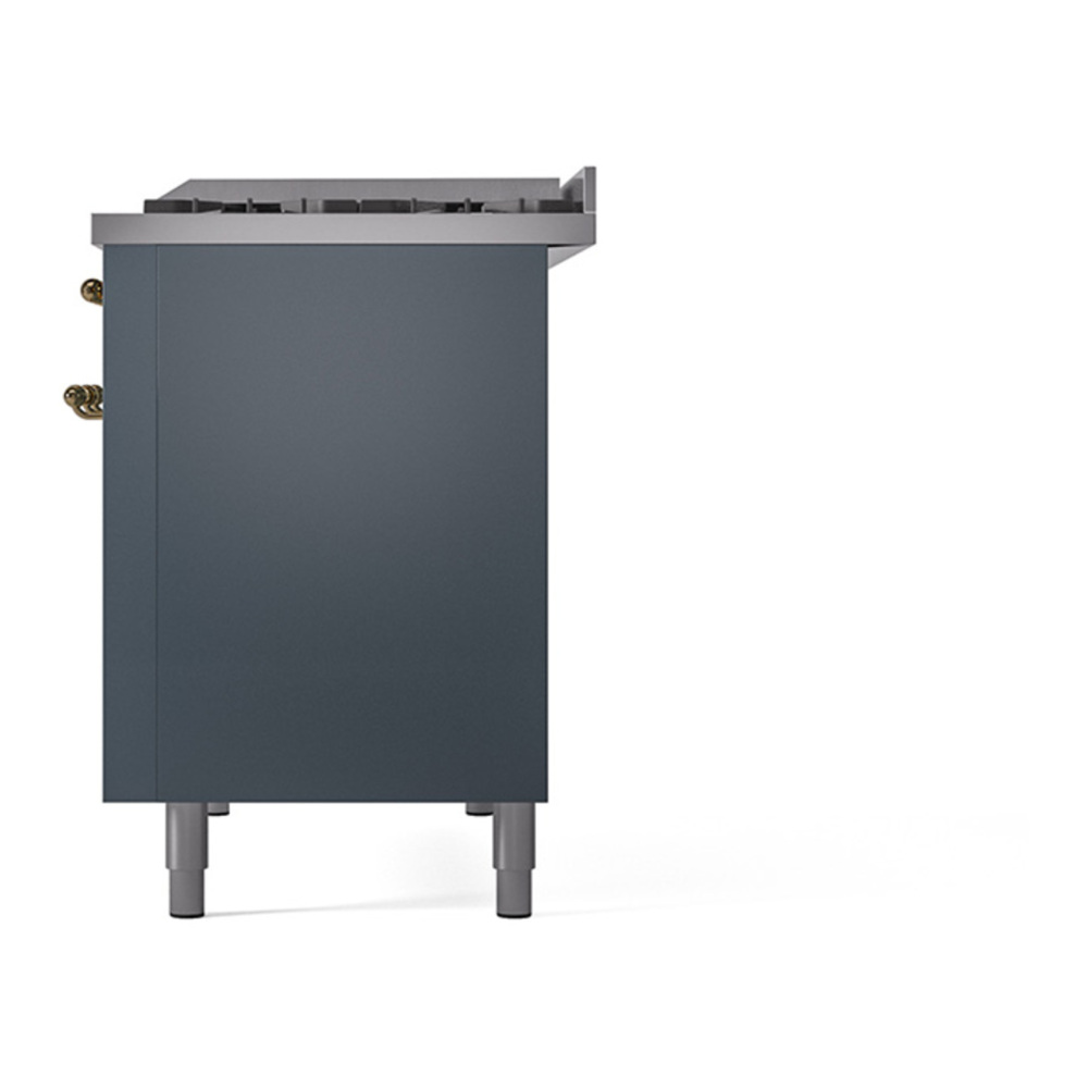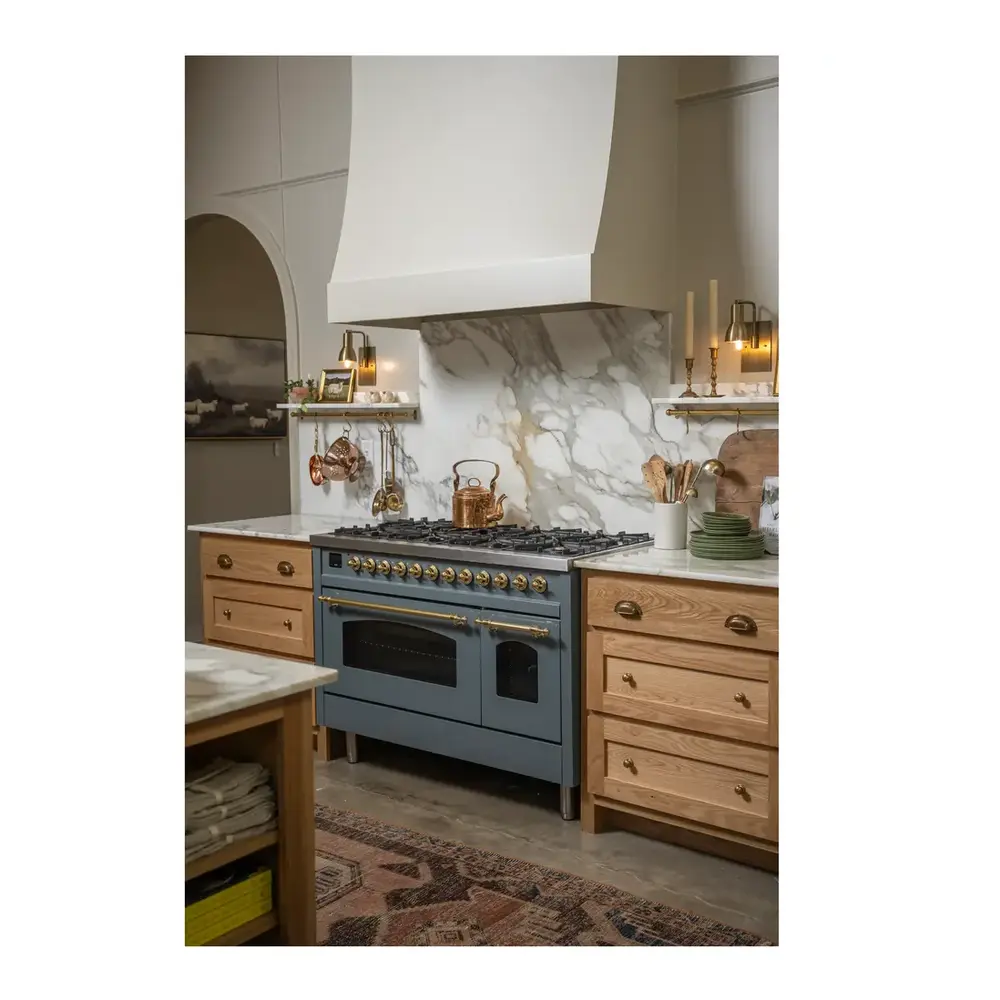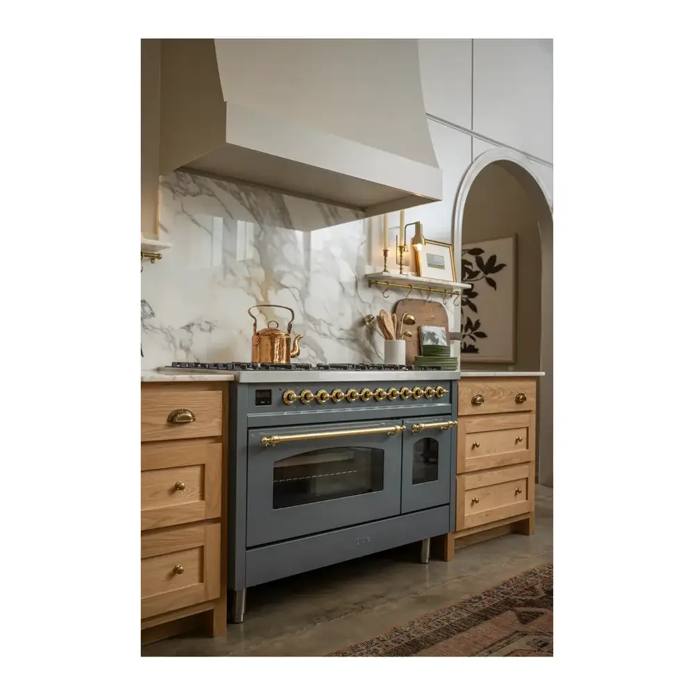 ILVE UP48FNMPBGGLP Nostalgie II 48 inch Dual Fuel Range with 5.02 cu. ft. Total Double Oven Capacity (8 Sealed Burners + Griddle, Liquid Propane, Triple Glass Door, Blue Grey, Brass)