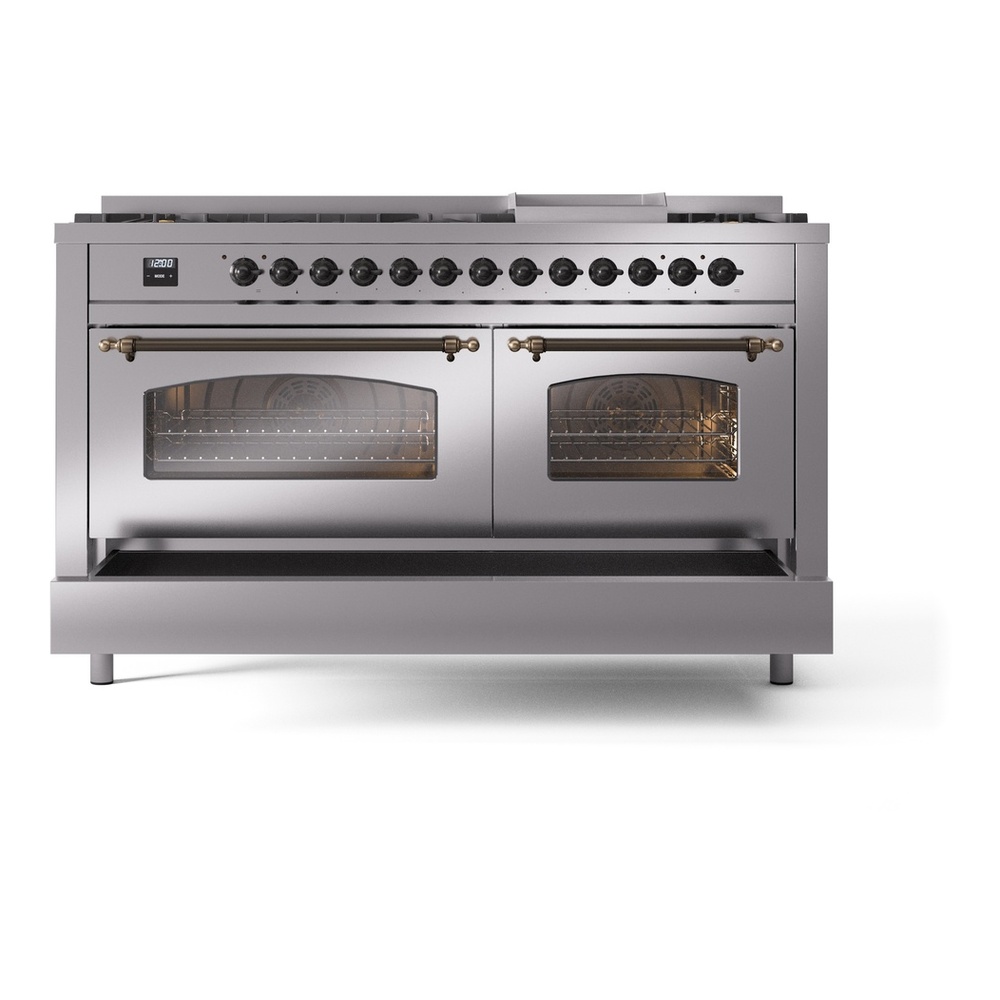 ILVE UP60FNMPSSB Nostalgie II 60 inch Dual Fuel Range (9 Sealed Burners + Griddle, Natural Gas, Triple Glass Door, Stainless Steel, Burnished)