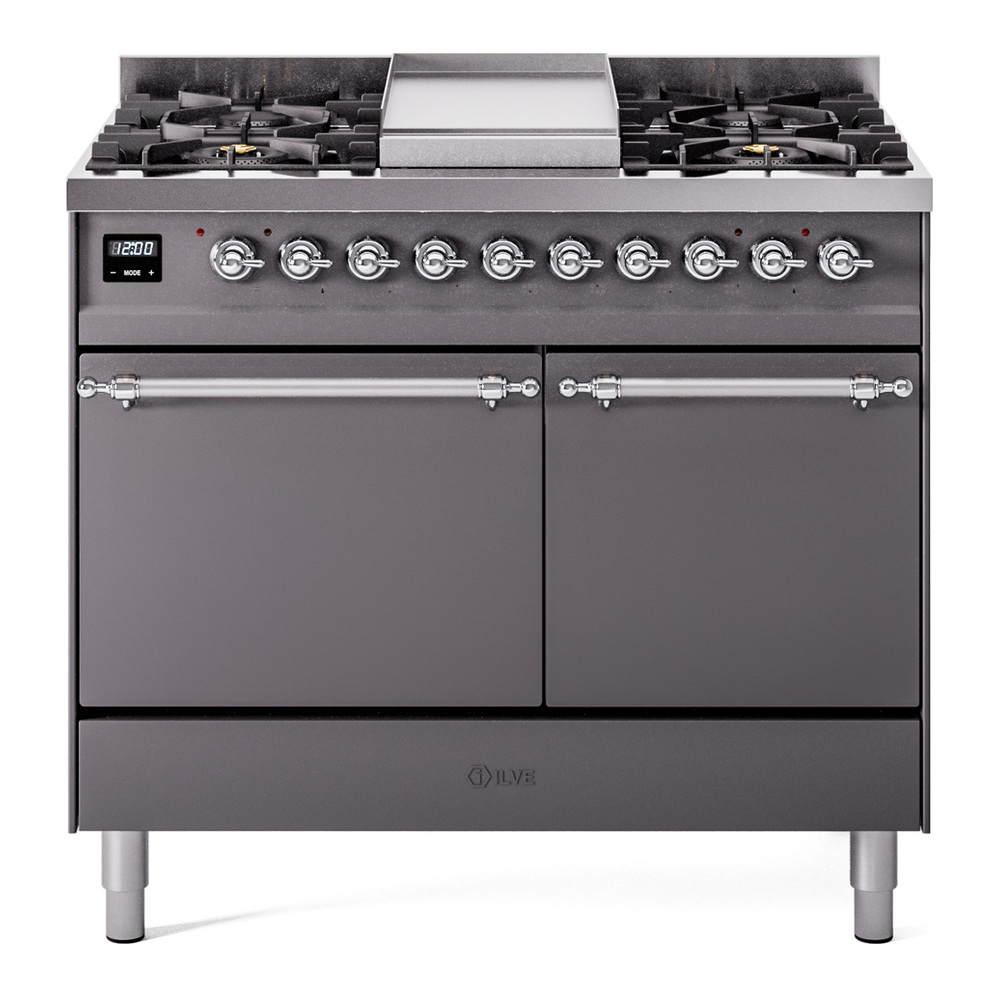ILVE UPD40FQNMPMGCLP Nostalgie II 40 inch Dual Fuel Range with Double Ovens, 6 Burners and Griddle (Liquid Propane, Solid Door, Graphite Matte, Chrome)