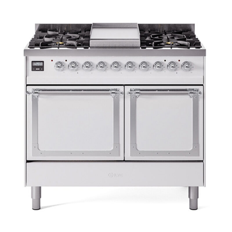 ILVE UPD40FNMPWHCLP Nostalgie II 40 inch Dual Fuel Range with Double Ovens, 6 Burners and Griddle (Liquid Propane, Triple Glass Door, White, Chrome)
