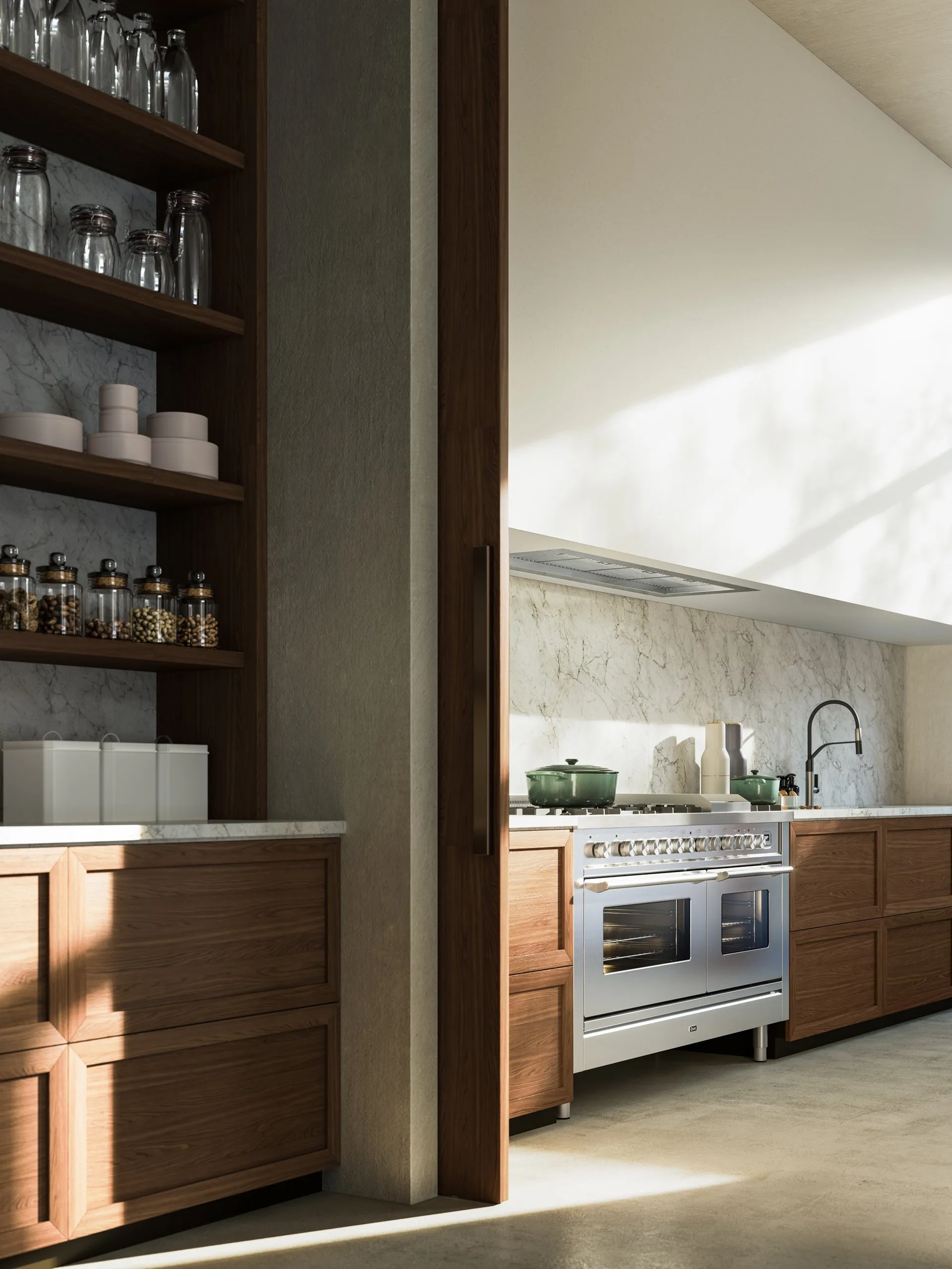 There is an interesting chiasmus between the white, mute masonry block containing the hood, which marks the entire longitudinal section of the worktop, and the full-height, wooden pocket door, a decidedly stately and celebratory doorway.